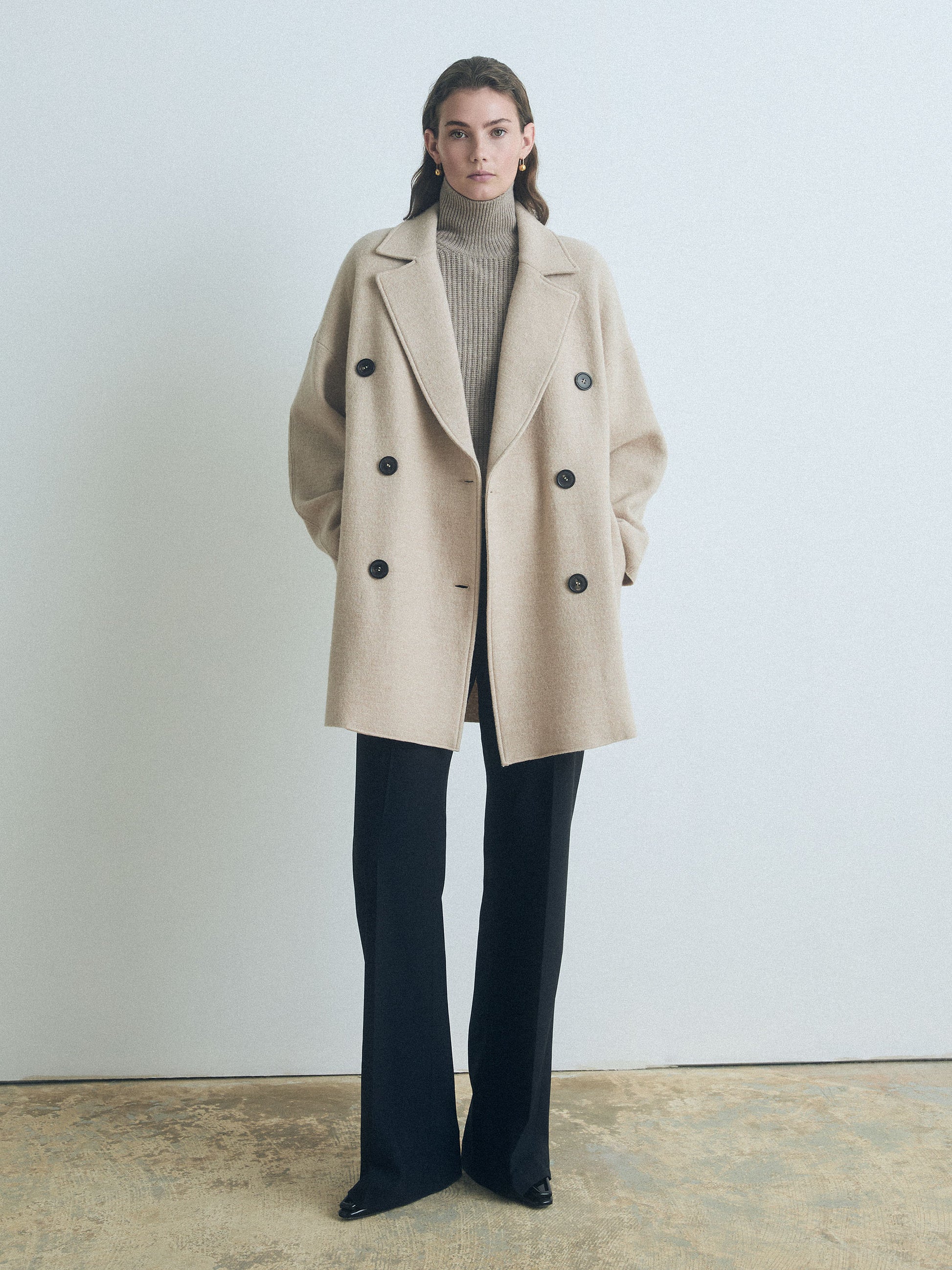 Double-breasted coat in virgin wool, made in Canada.