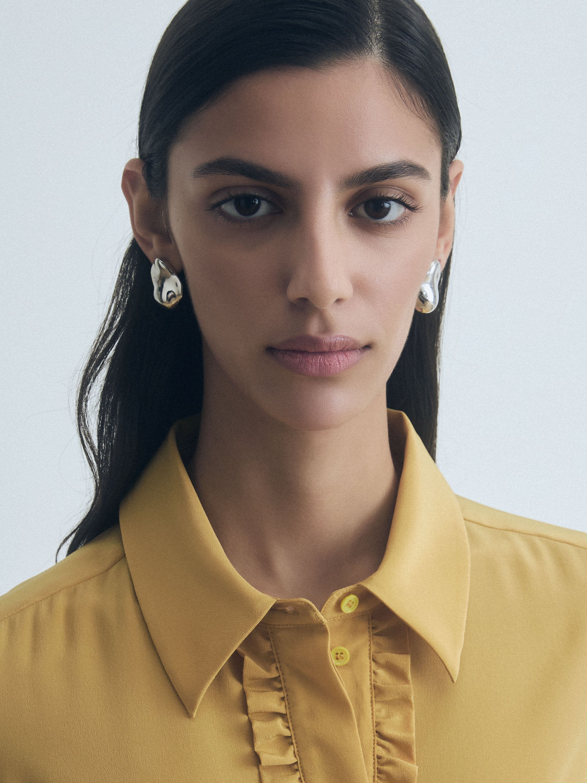 Silk blouse with a classic shirt collar and concealed button placket. Features a ruffle detail at the front.