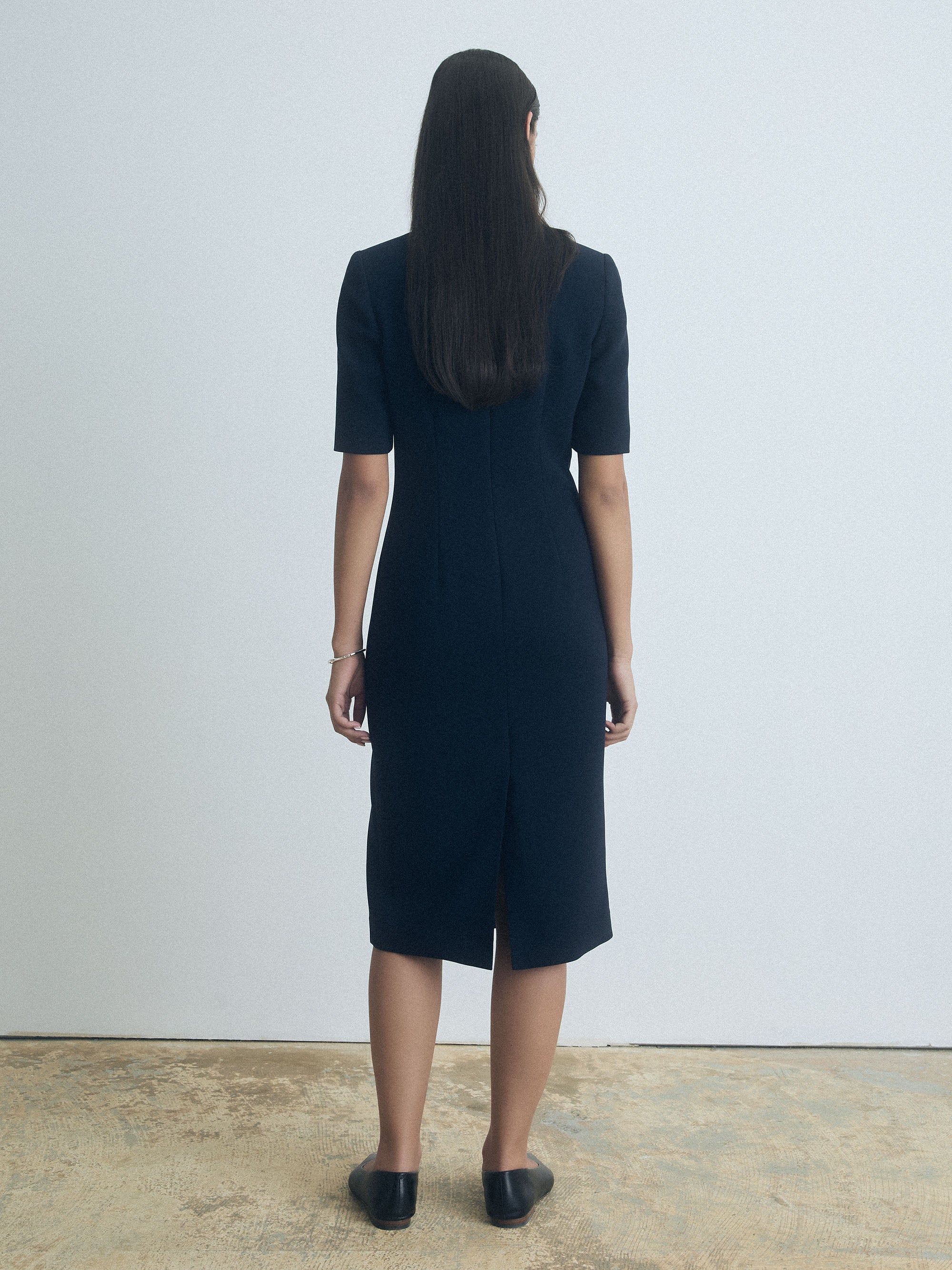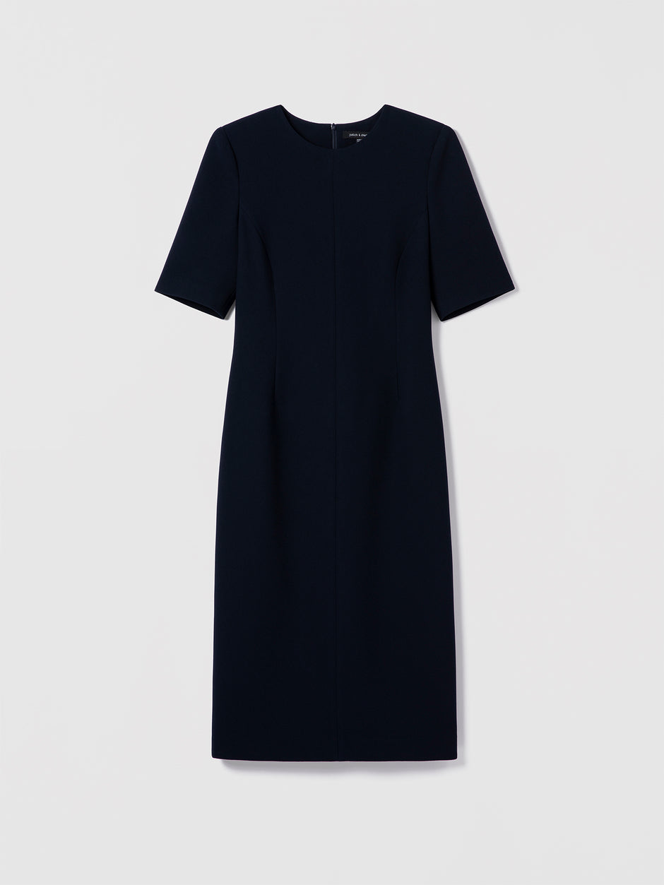 Crew‑neck stretch crepe dress with elbow‑length sleeves and front darts for a tailored fit. Falls below the knee, with an invisible back zipper and full lining.