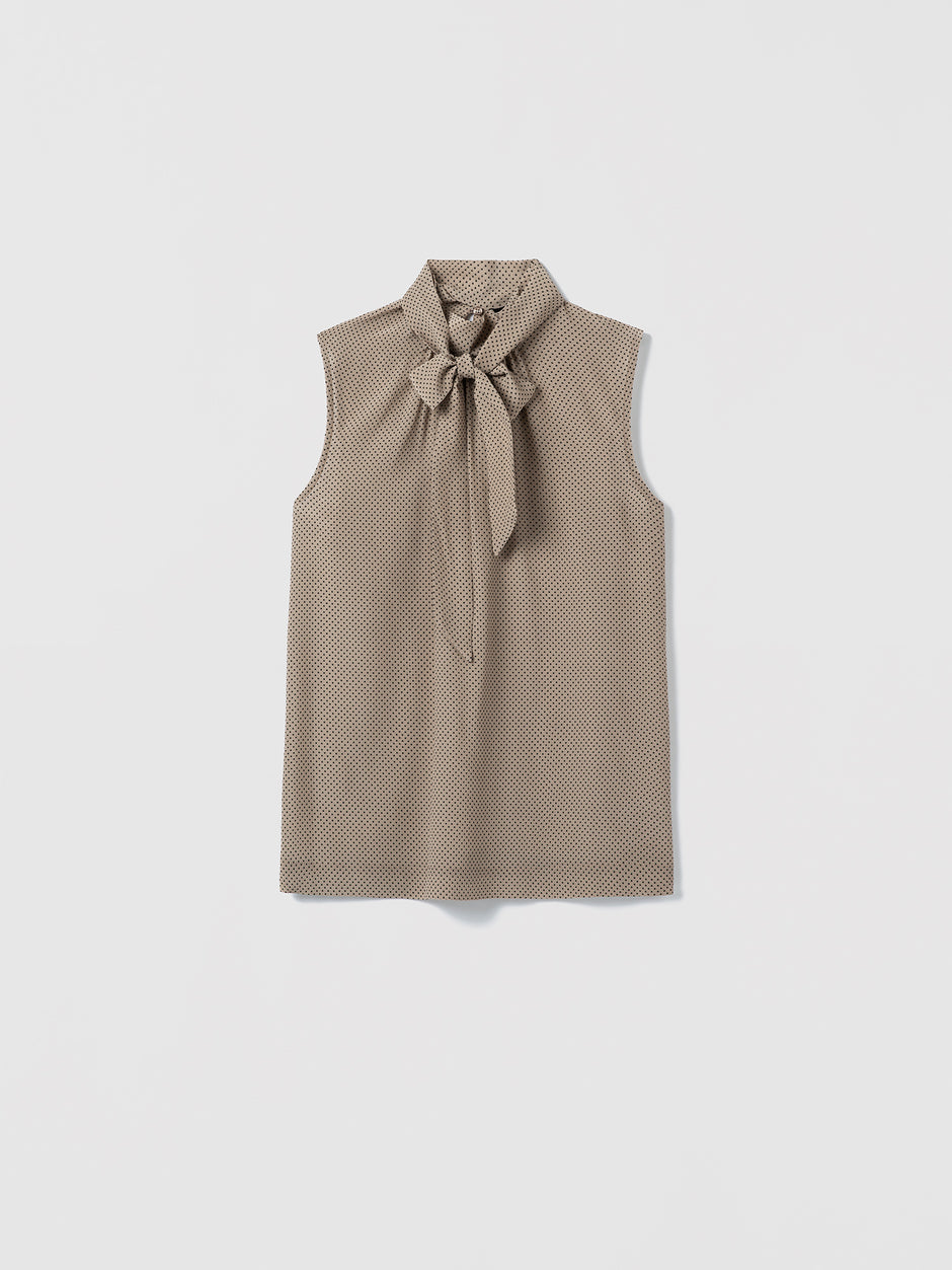 A sleeveless silk blouse adorned with subtle polka dots, finished with an attached scarf neckline.