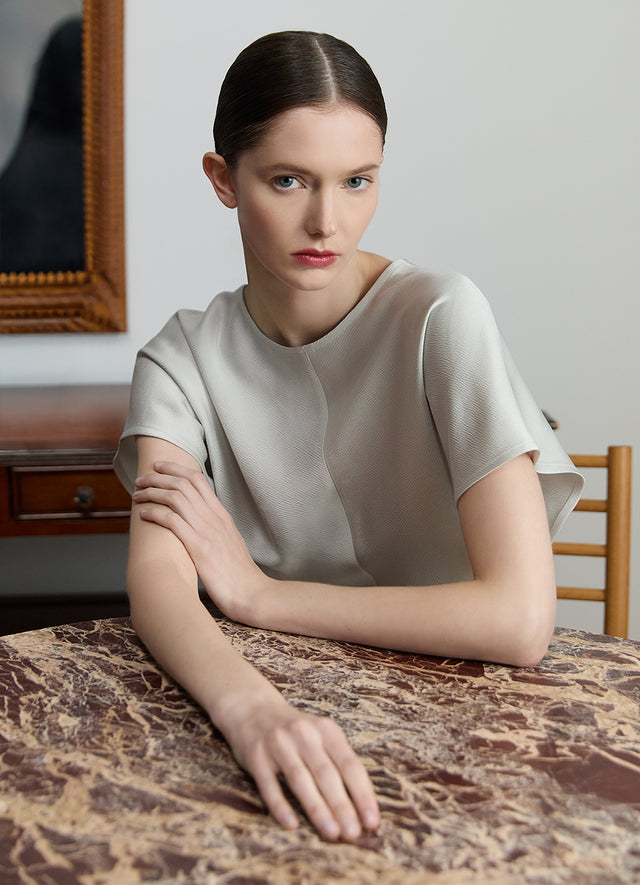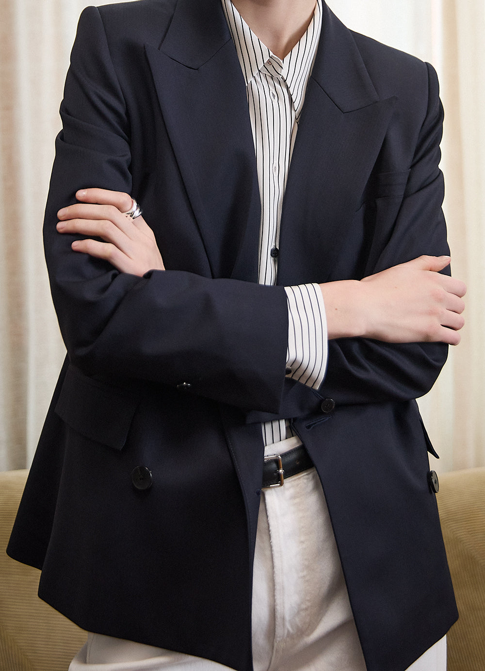 A tailored silhouette in easy-care techno fabric, finished with a single-button closure and precise waist detailing for modern refinement.