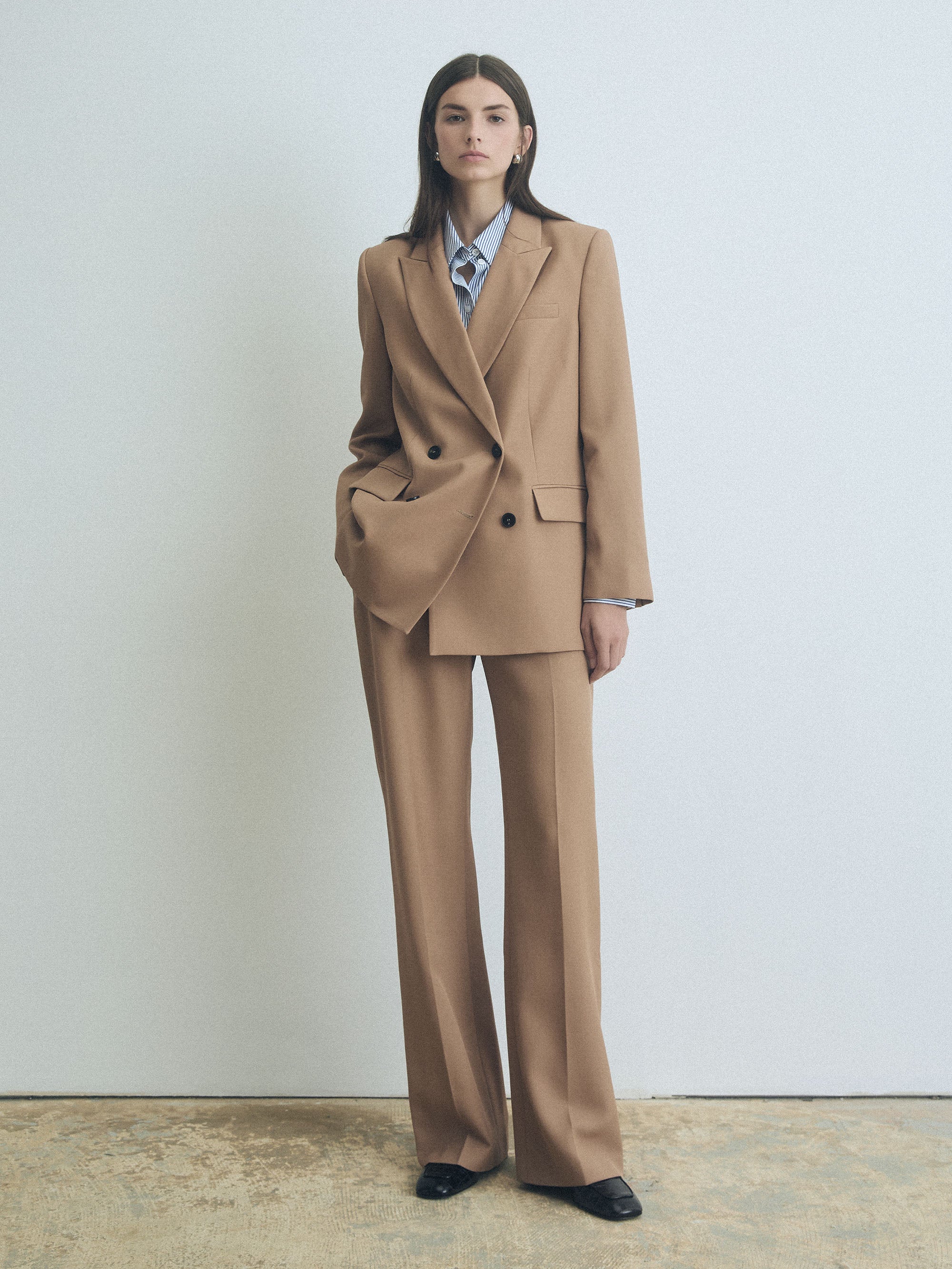 Tailored wool jacket with peak lapel, flap and welt pockets, single back vent, fully lined.