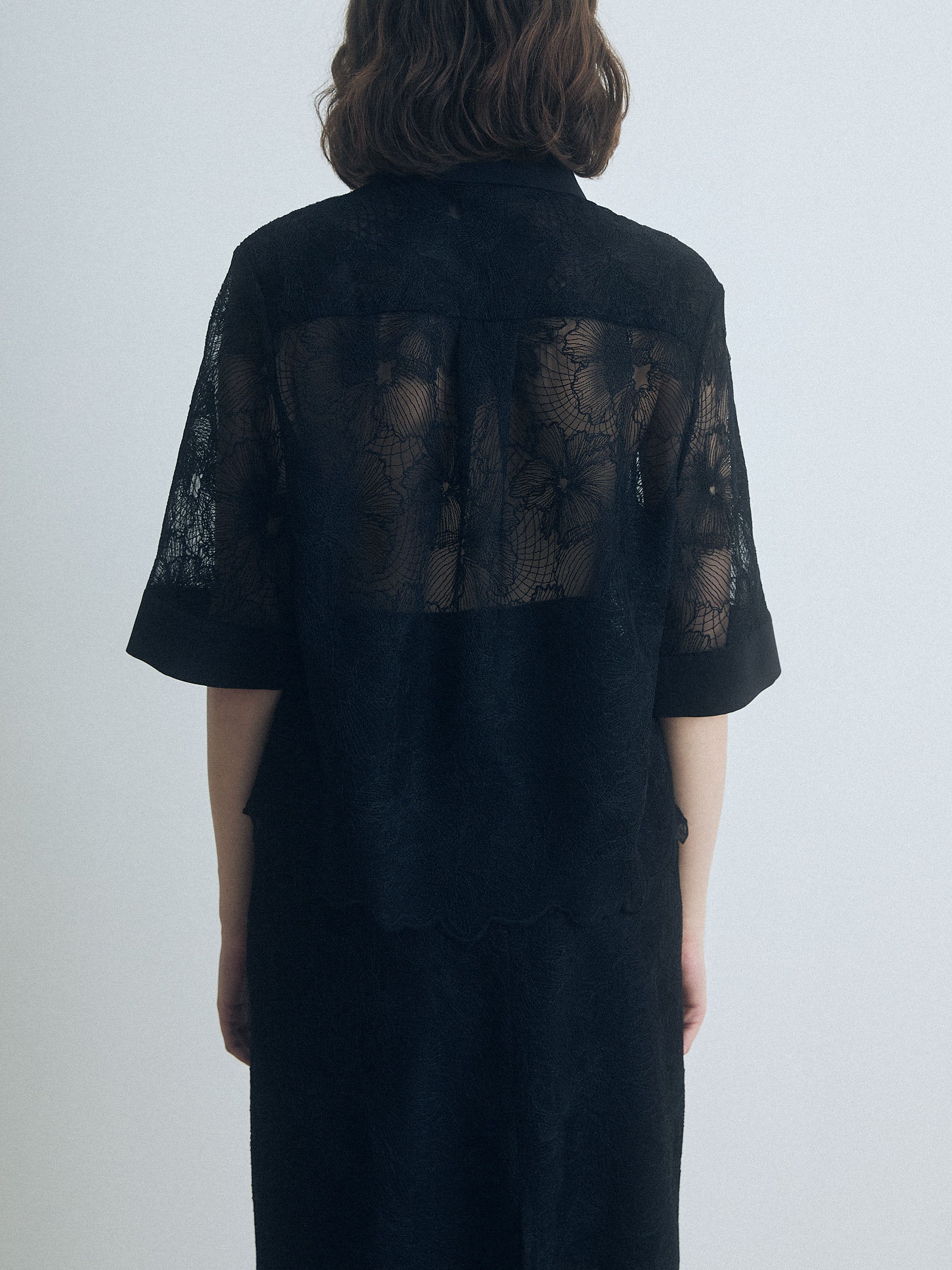 • Black lace shirt by Judith & Charles featuring a stand collar, front button closure, two patch pockets, and scalloped lace hem; unlined.