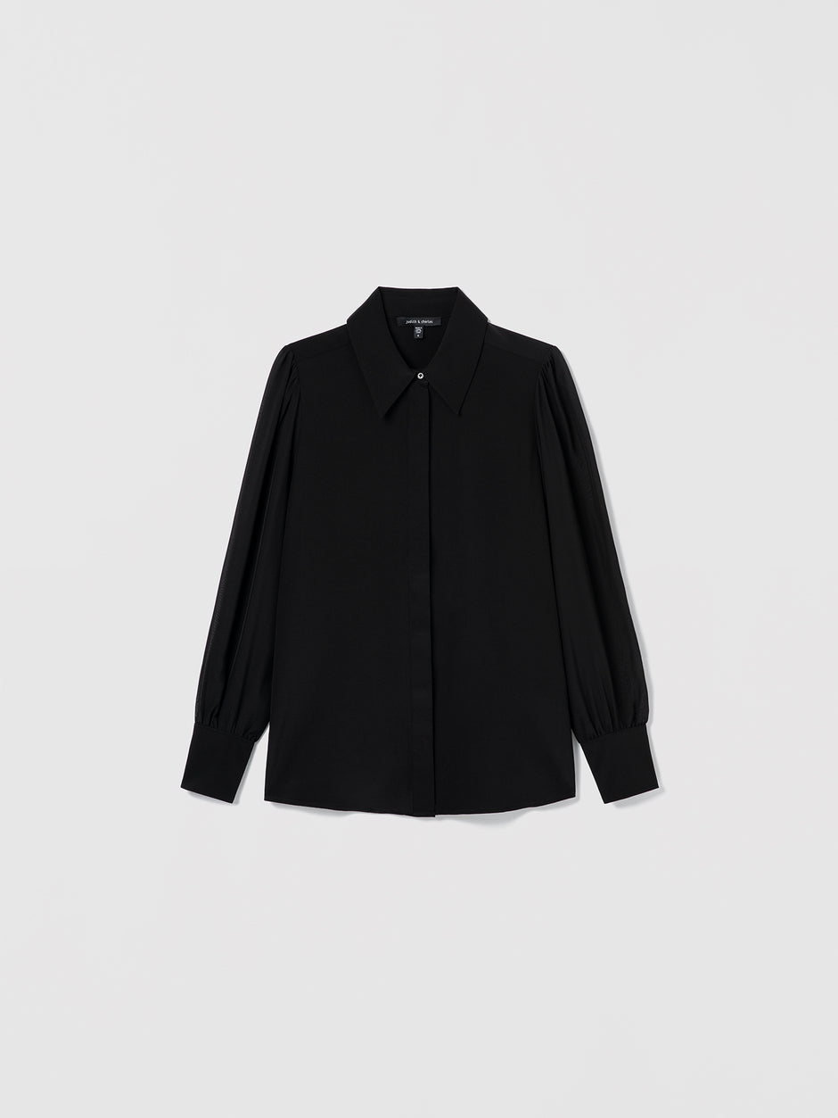 • Black silk blouse from Judith & Charles with a classic collar and concealed button placket.