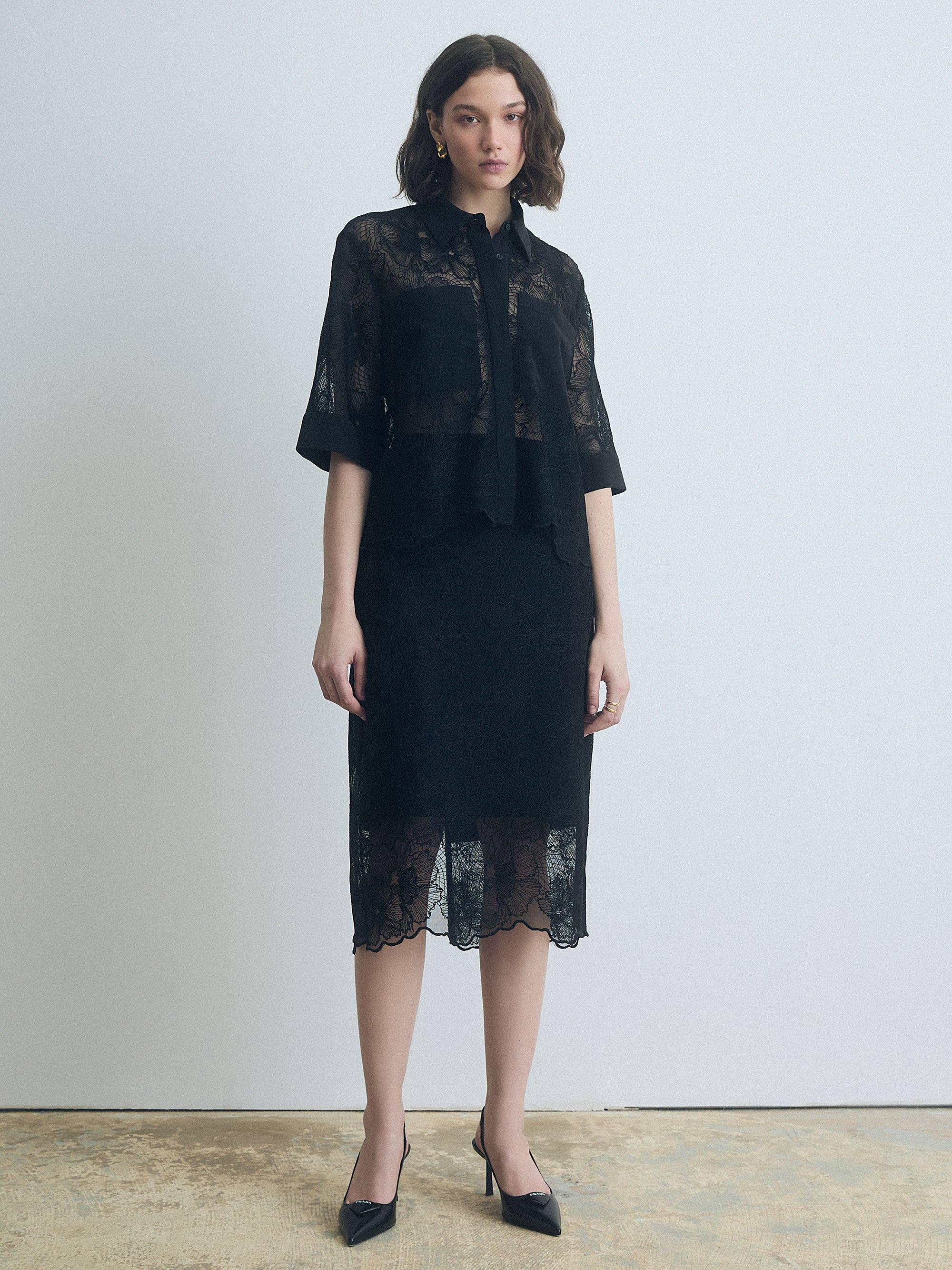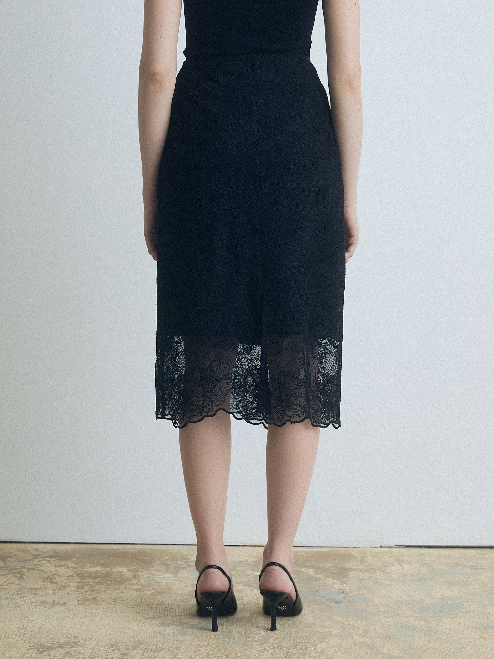 Jupe en dentelle à ourlet festonné et fente arrière. Ceinture épurée, fermeture invisible au dos. Entièrement doublée en soie.