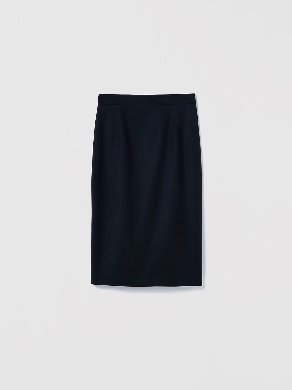 • Person wearing an ocean blue blouse and navy skirt against a plain background