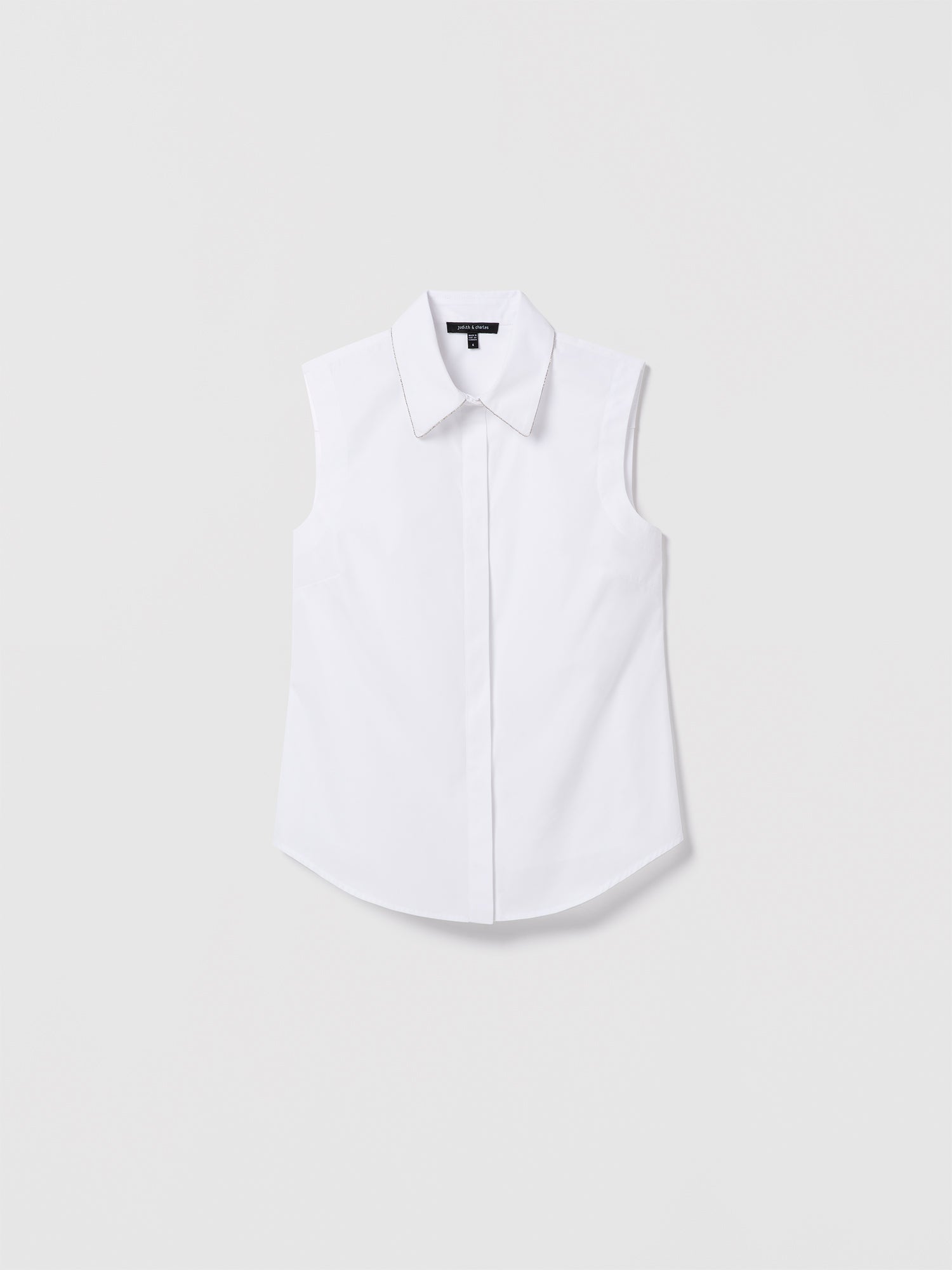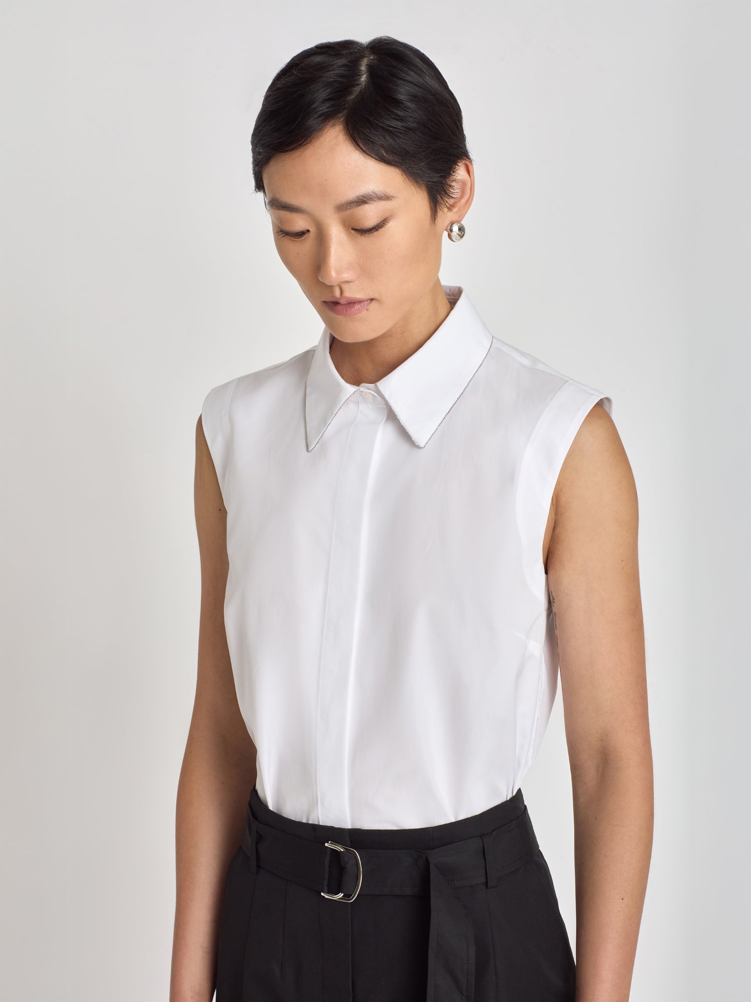Blouse sans manches en popeline de coton avec patte de boutonnage cachée et col à finition boules, silhouette ajustée, fabriquée au Canada à partir de tissu italien.