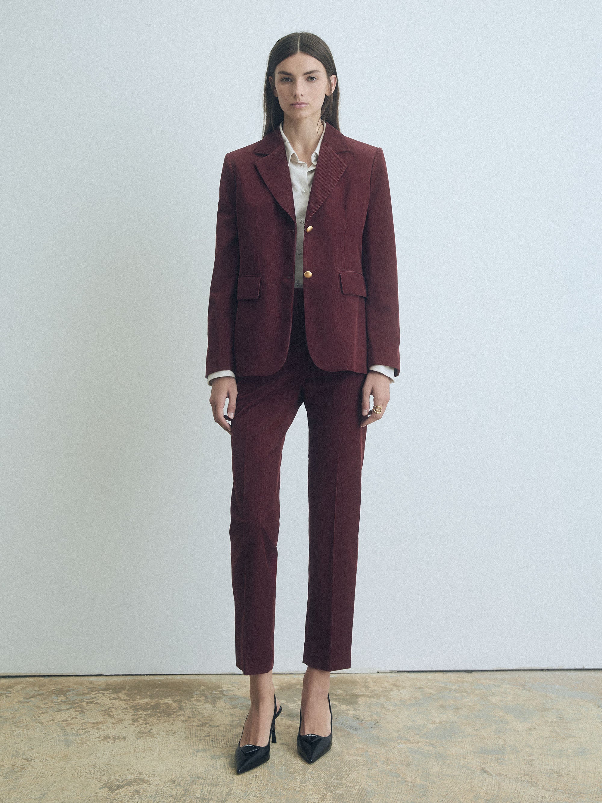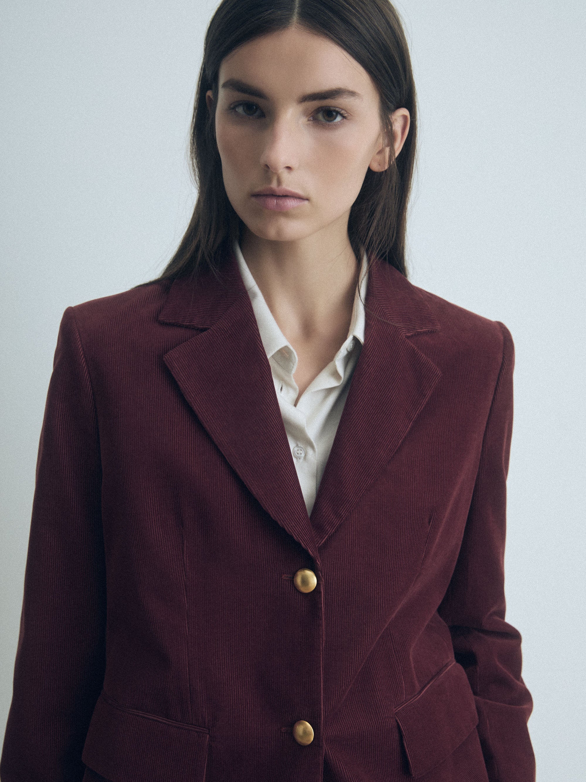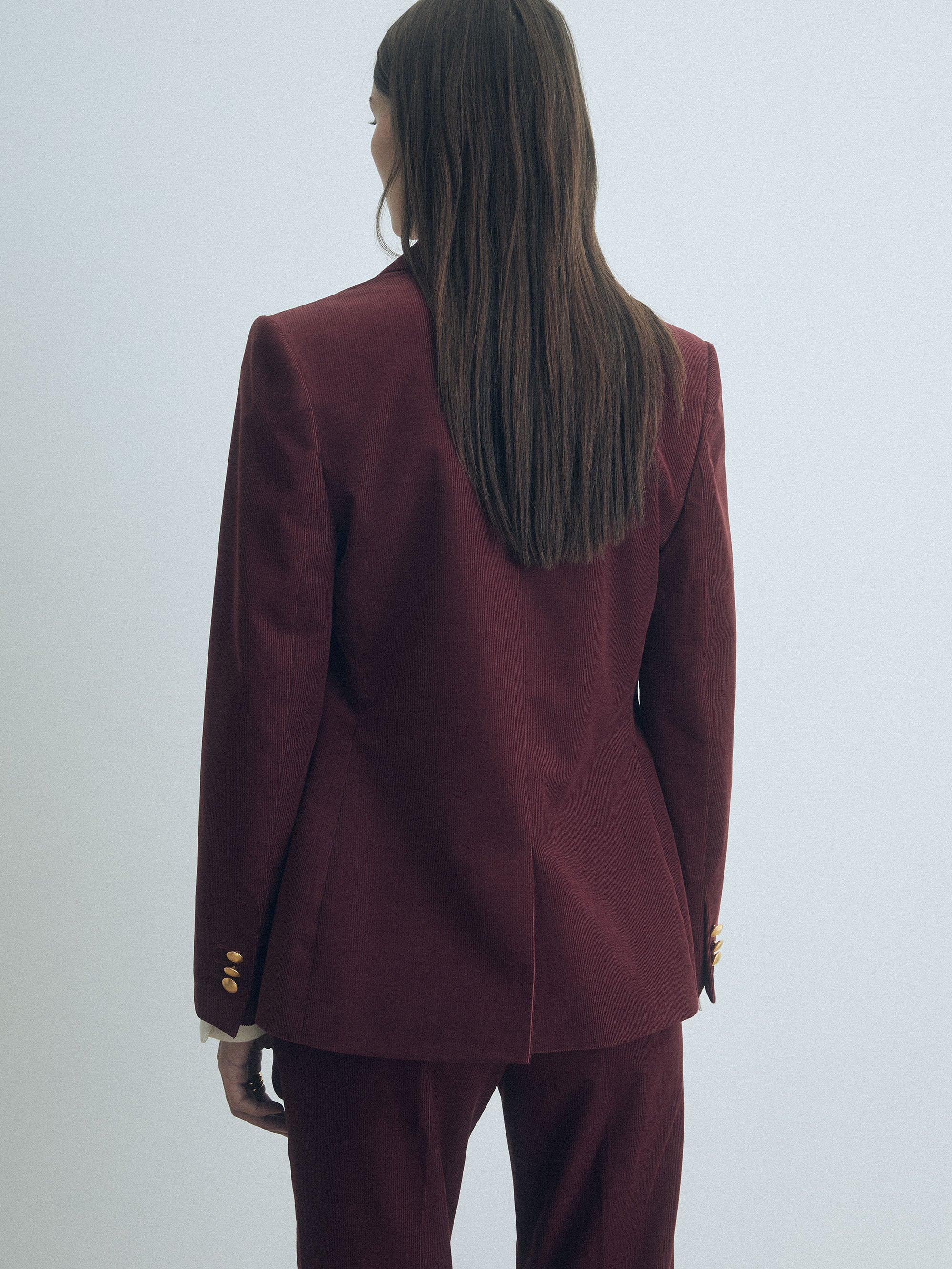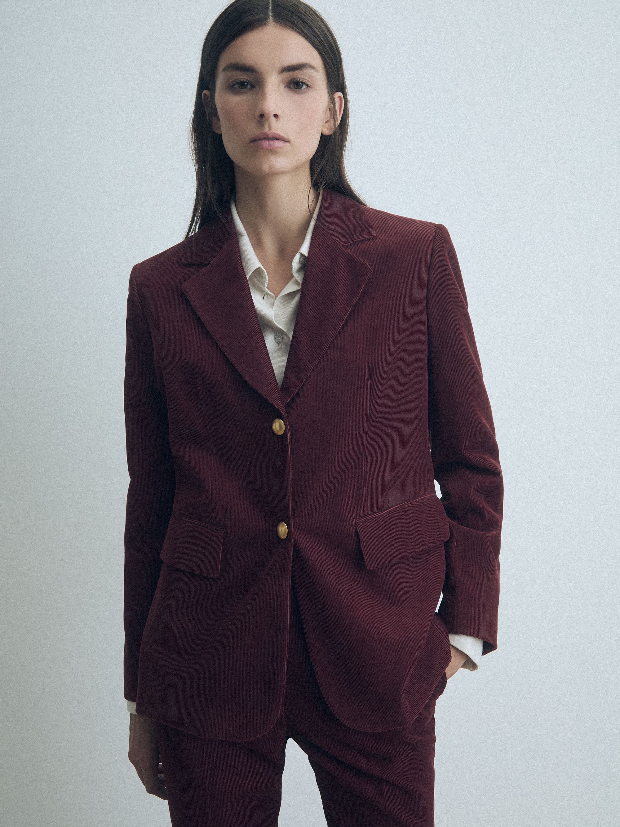 Veste en velours côtelé extensible avec boutons dorés et poches à rabat. Entièrement doublée.
