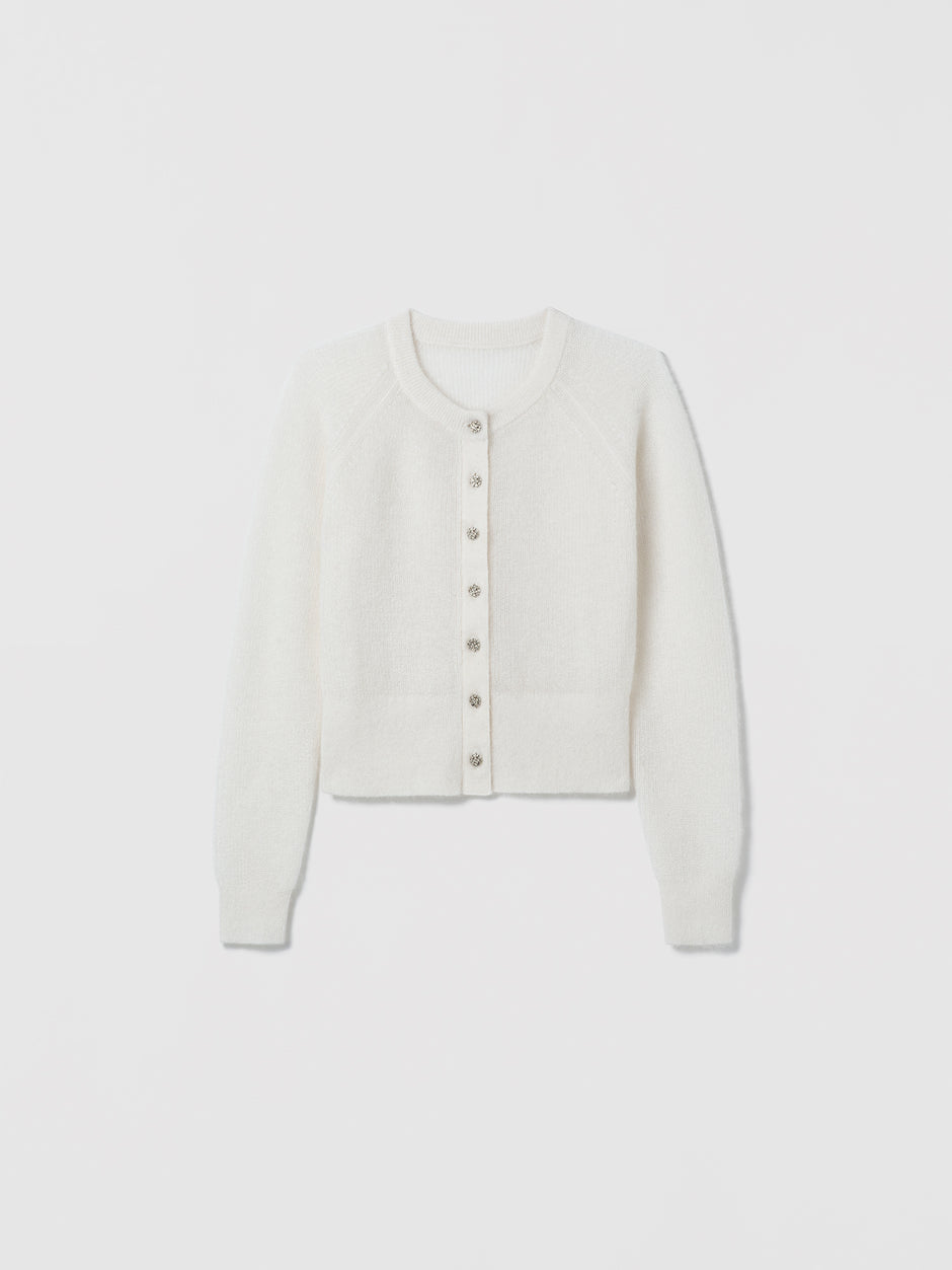• Off White Idina-b cardigan by Judith and Charles in mohair knit with crew neckline and embellished front button closure, made from Italian fabric