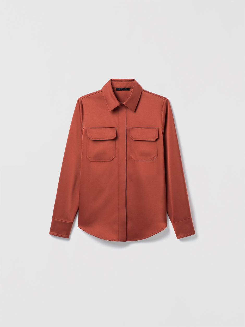 Chemise structurée en mélange de satin matte japonais, dotée d’une patte boutonnée dissimulée et de deux poches poitrine.