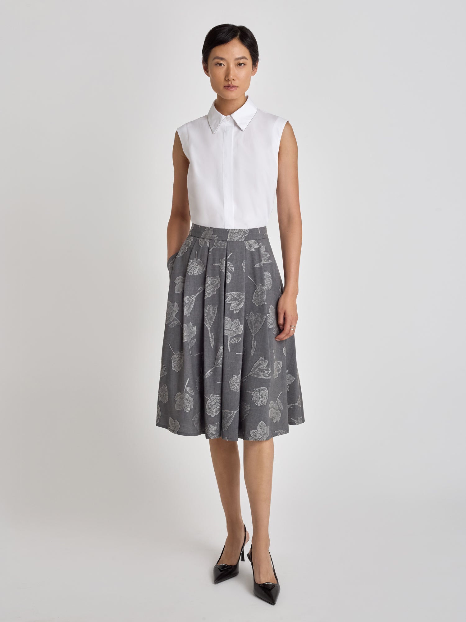 Jupe en jacquard fleuri en laine vierge stretch de Loro Piana, longueur sous le genou.