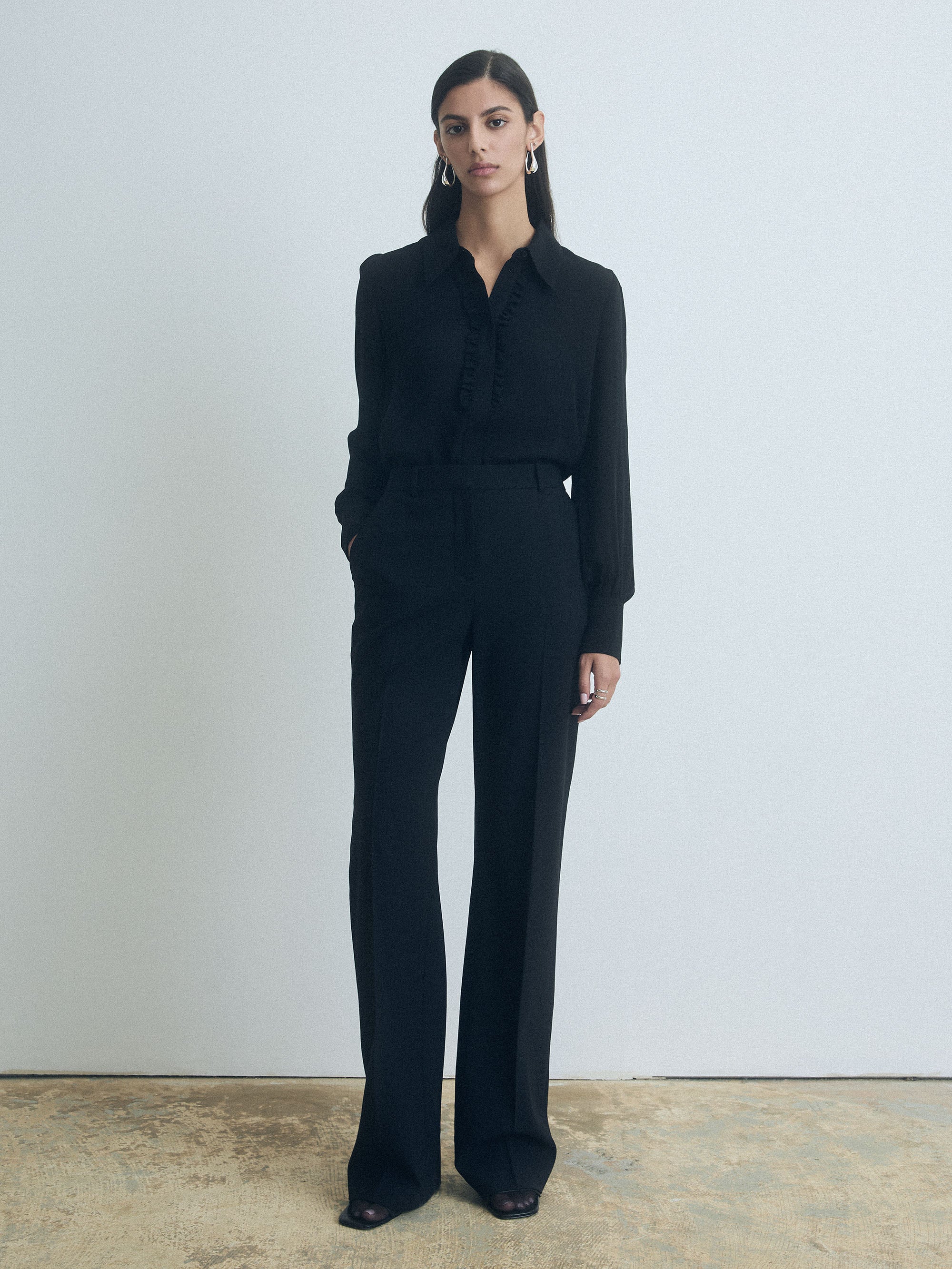 Blouse en soie avec col chemise classique et patte de boutonnage dissimulée, ornée de volants sur le devant.