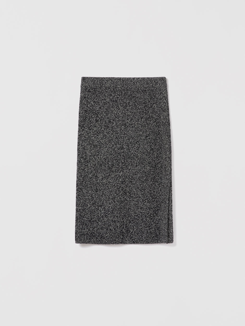 Jupe droite à enfiler en laine moulinée, confectionnée en 100% laine extrafine italienne.