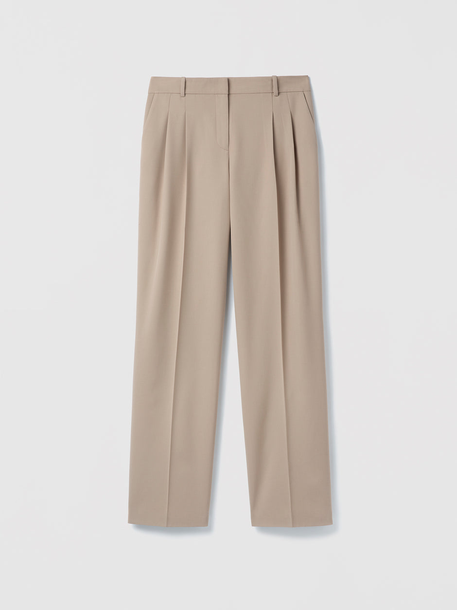 • Woman wearing a black sleeveless top and beige pants against a light background