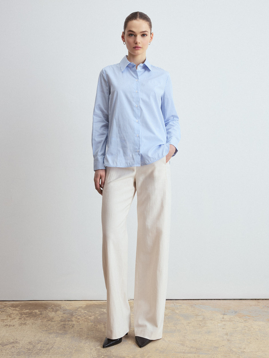 Un pantalon épuré en laine vierge italienne, coupé avec une ligne sobre et précise. Doté d’une ceinture structurée et de finitions nettes.