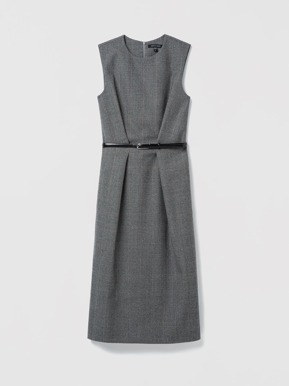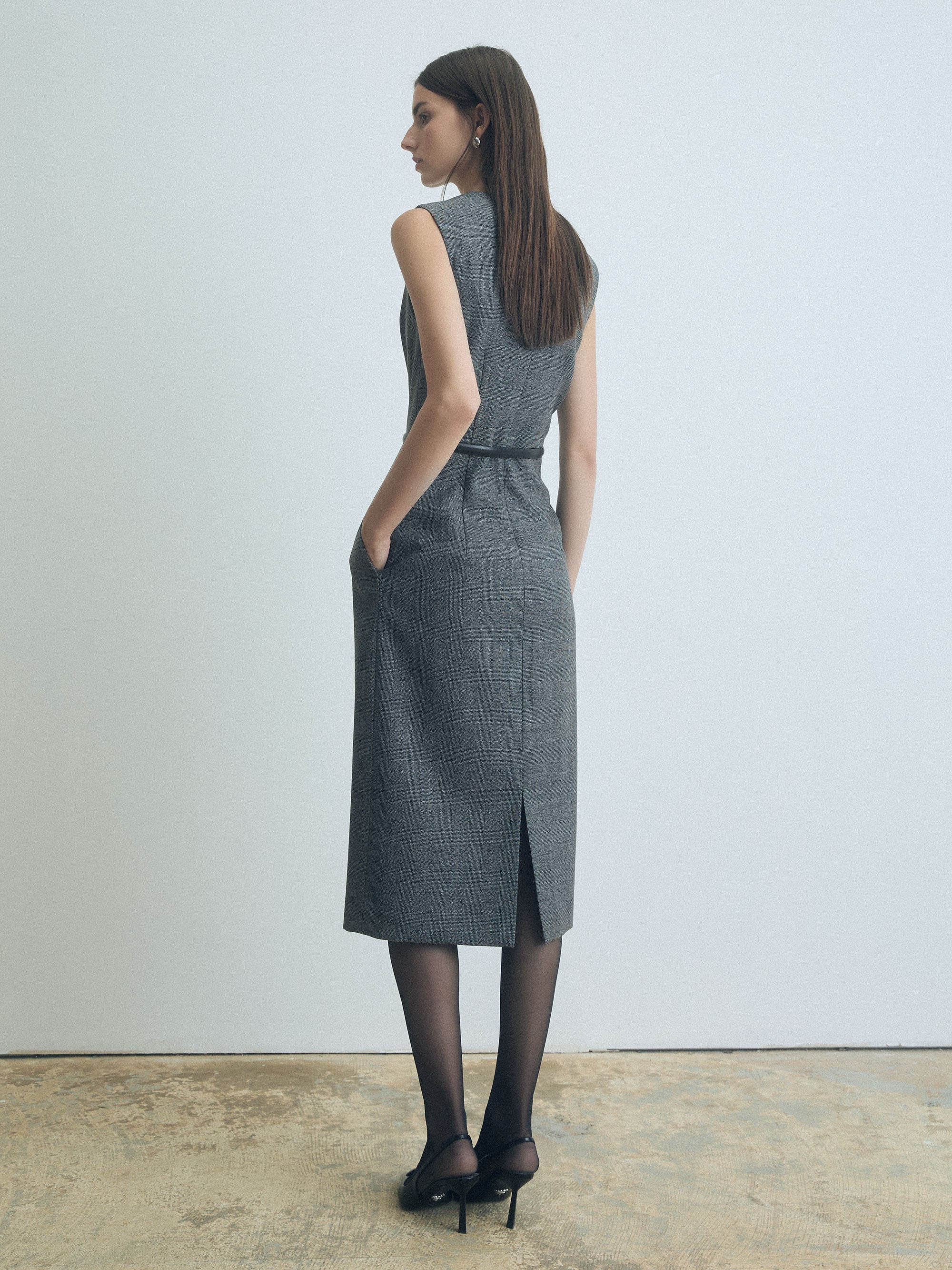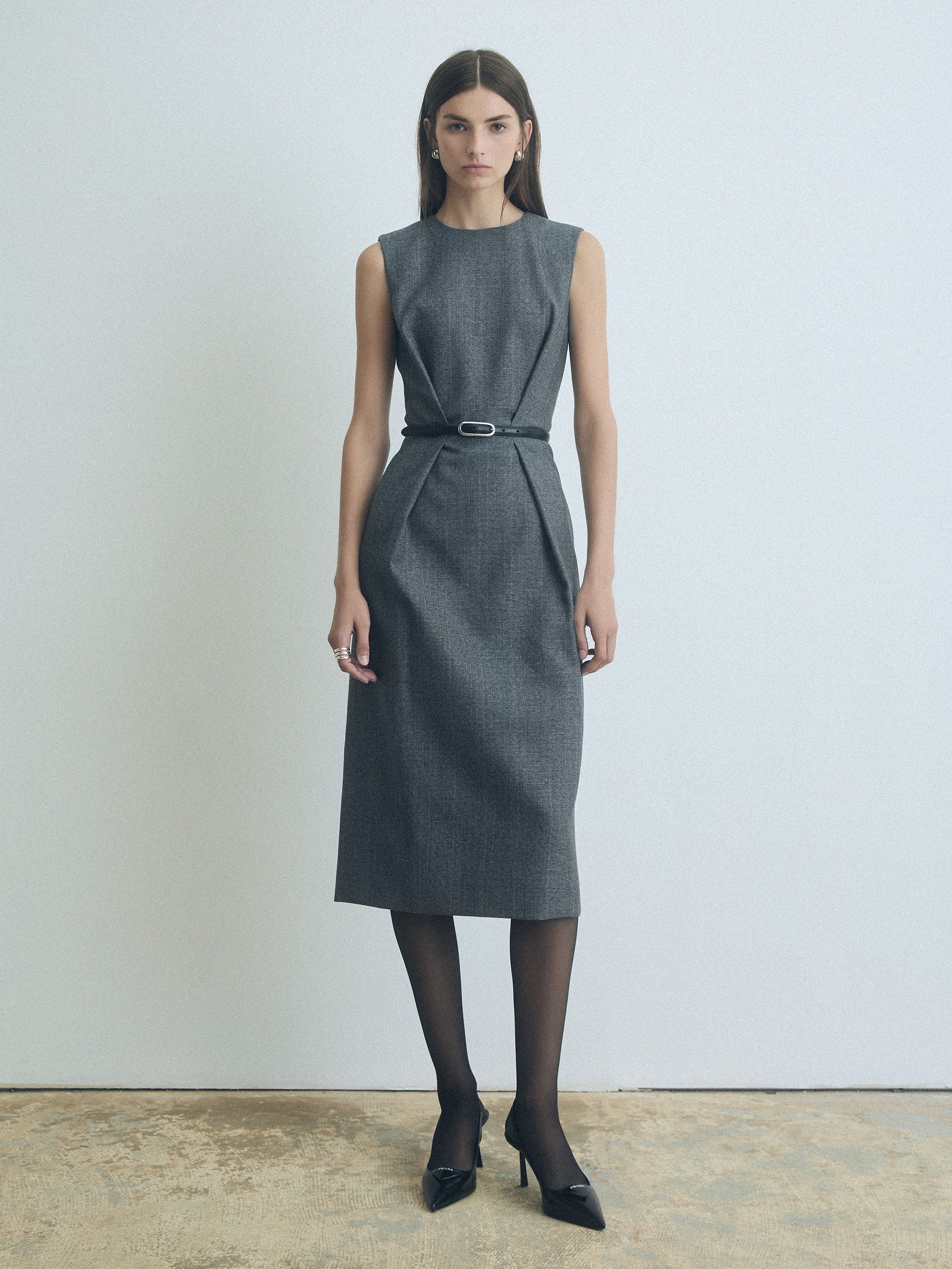 Robe sans manches en laine, avec encolure ras-du-cou, fente arrière et ceinture en cuir. Fermeture invisible au dos.