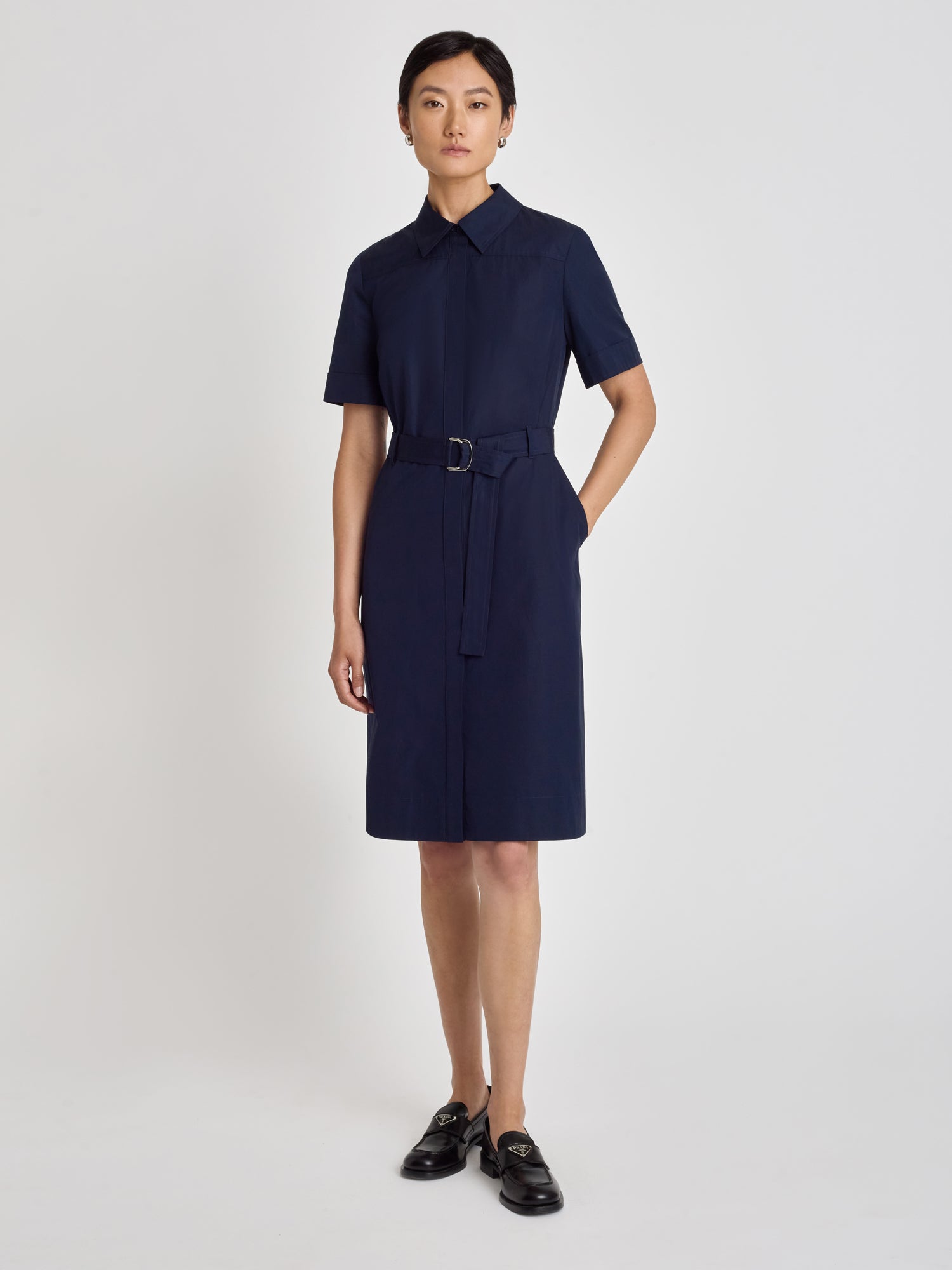 Robe chemise en popeline à manches courtes, avec poches en biais, patte de boutonnage invisible et ceinture à la taille. Fabriquée au Canada en coton 100 %.