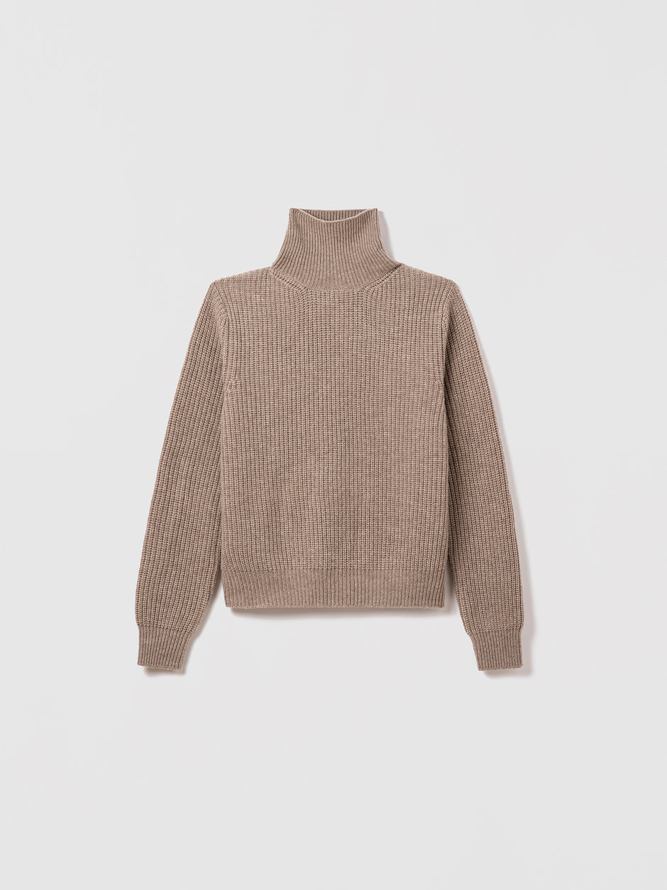 • Model wearing wrap skirt in 100% chocolate suede, unlined and made in Turkey with taupe turtle neck