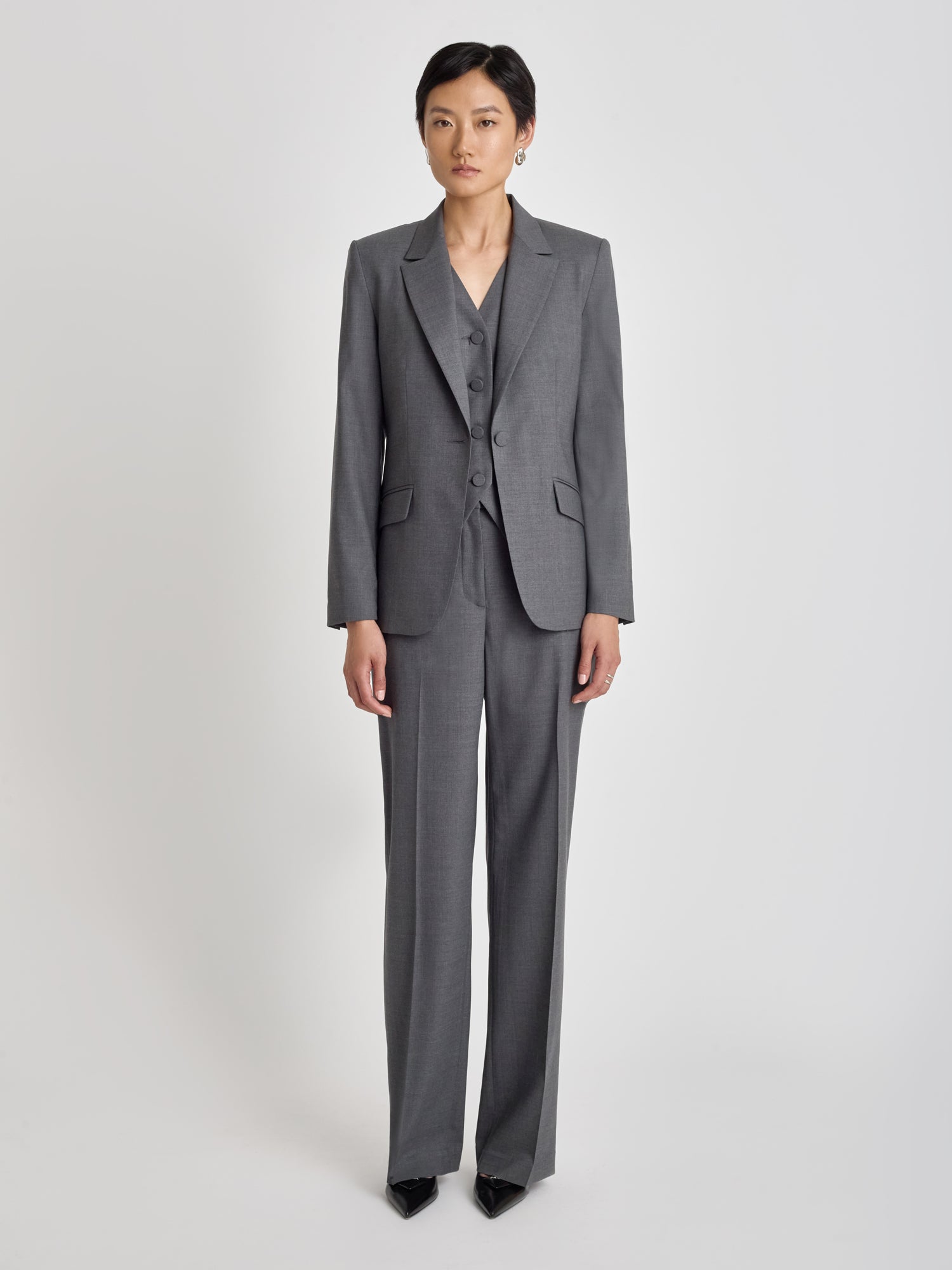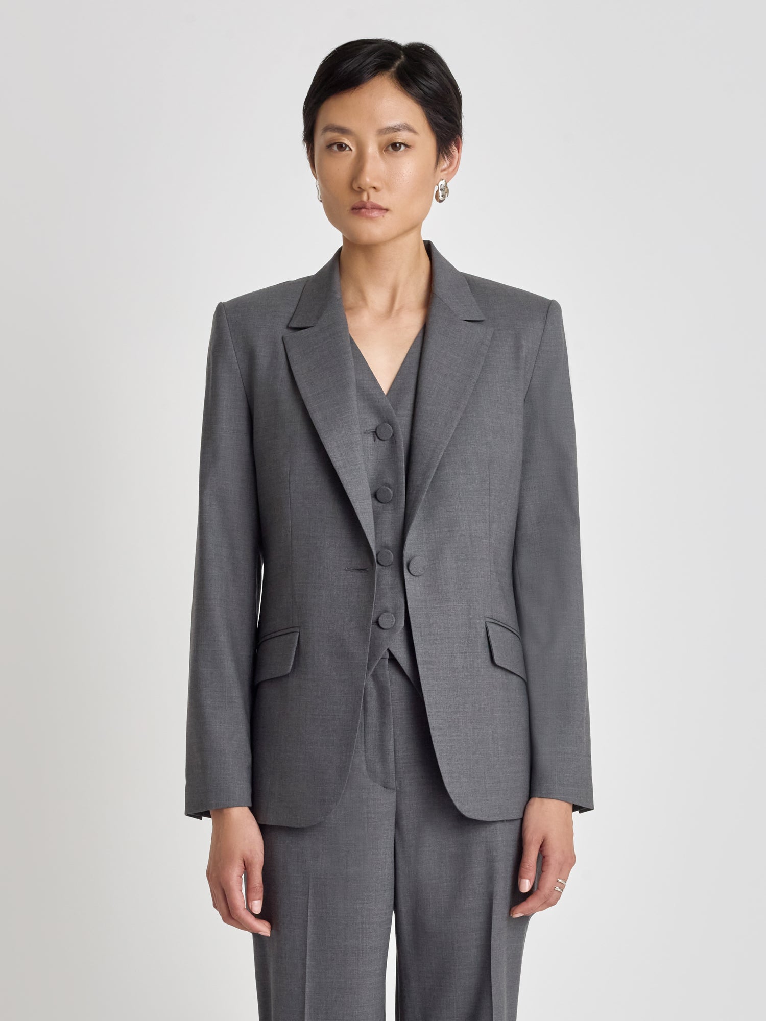 • Grey melange single-breasted jacket in superfine wool by Loro Piana, cut in a classic semi-fitted silhouette with peak lapel, flap pockets, and single back vent. Fully lined. Made in Canada with Italian fabric. Lexi Jacket, style 696-1976 by Judith & Charles