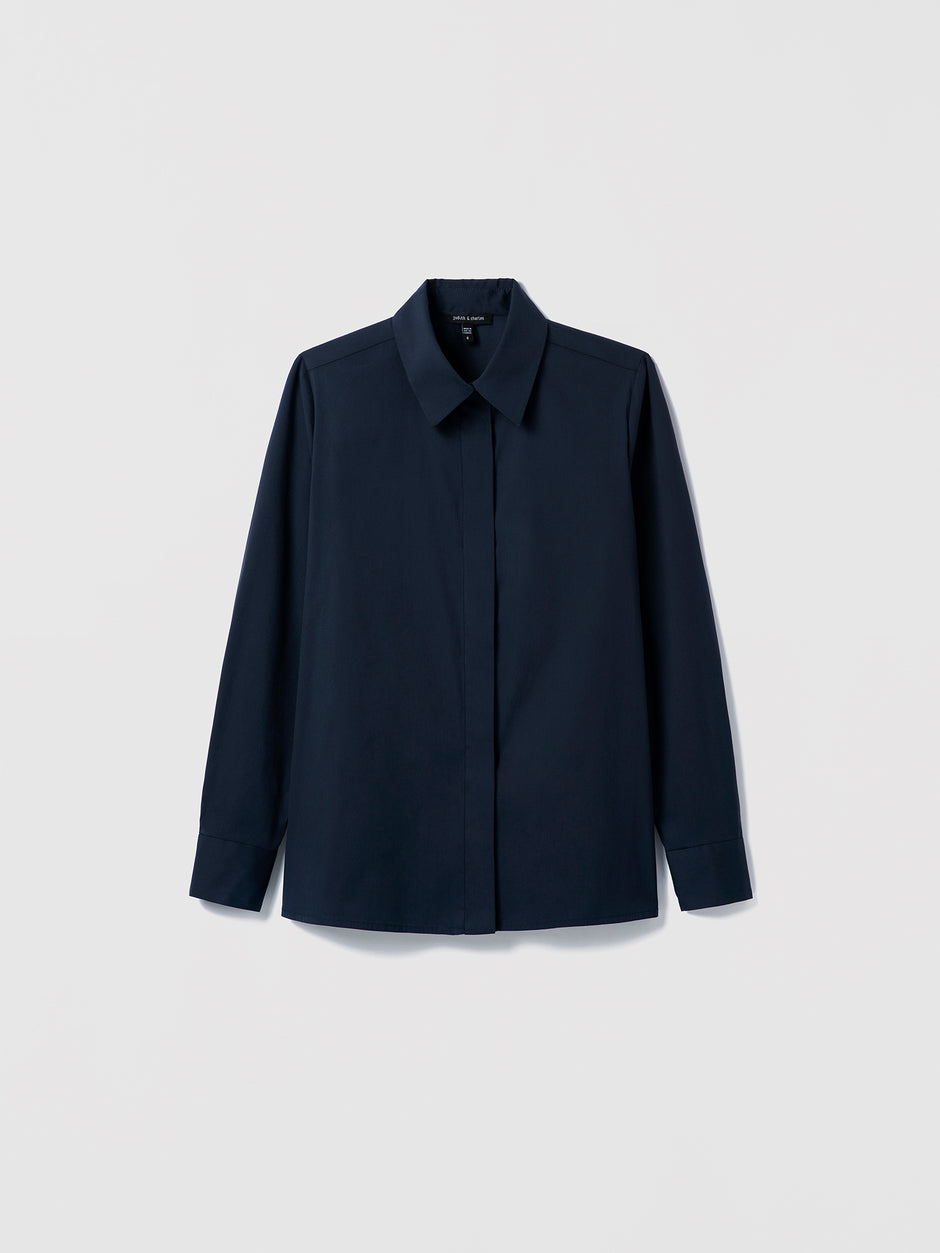 • Navy Cotton‑blend blouse with spread collar and hidden button placket shown in a clean, structured silhouette
