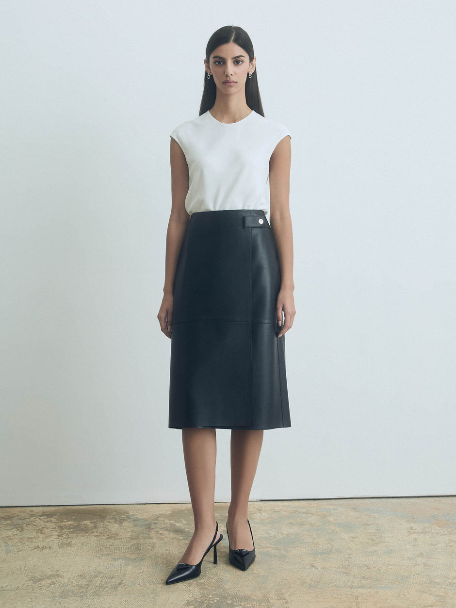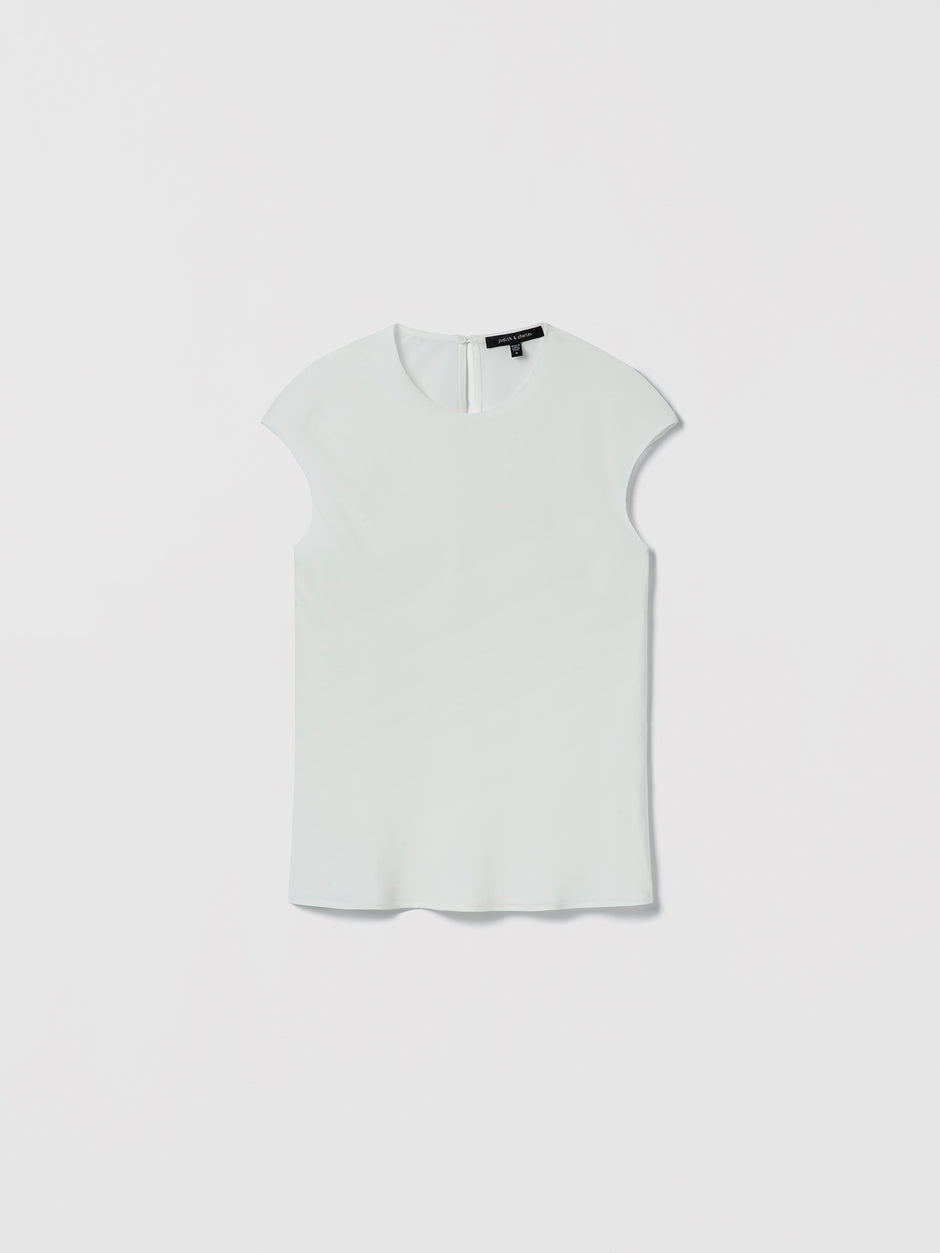 • Woman wearing Judith & Charles white silk crew neck top — double-layer front, bias cut, back keyhole with button.