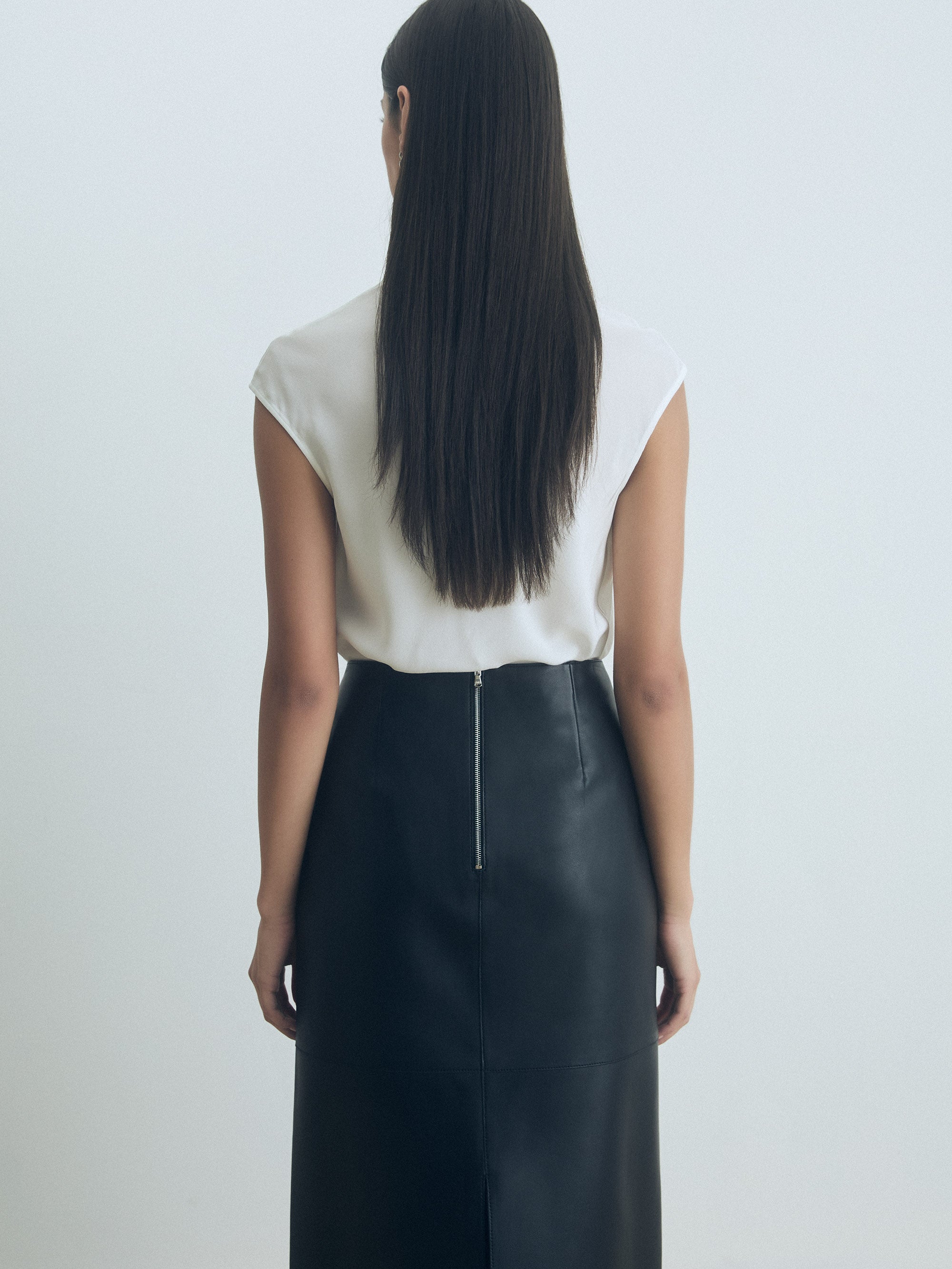 Silk crew neck top with a double-layer front and keyhole button closure at the back. Cut on the bias.
