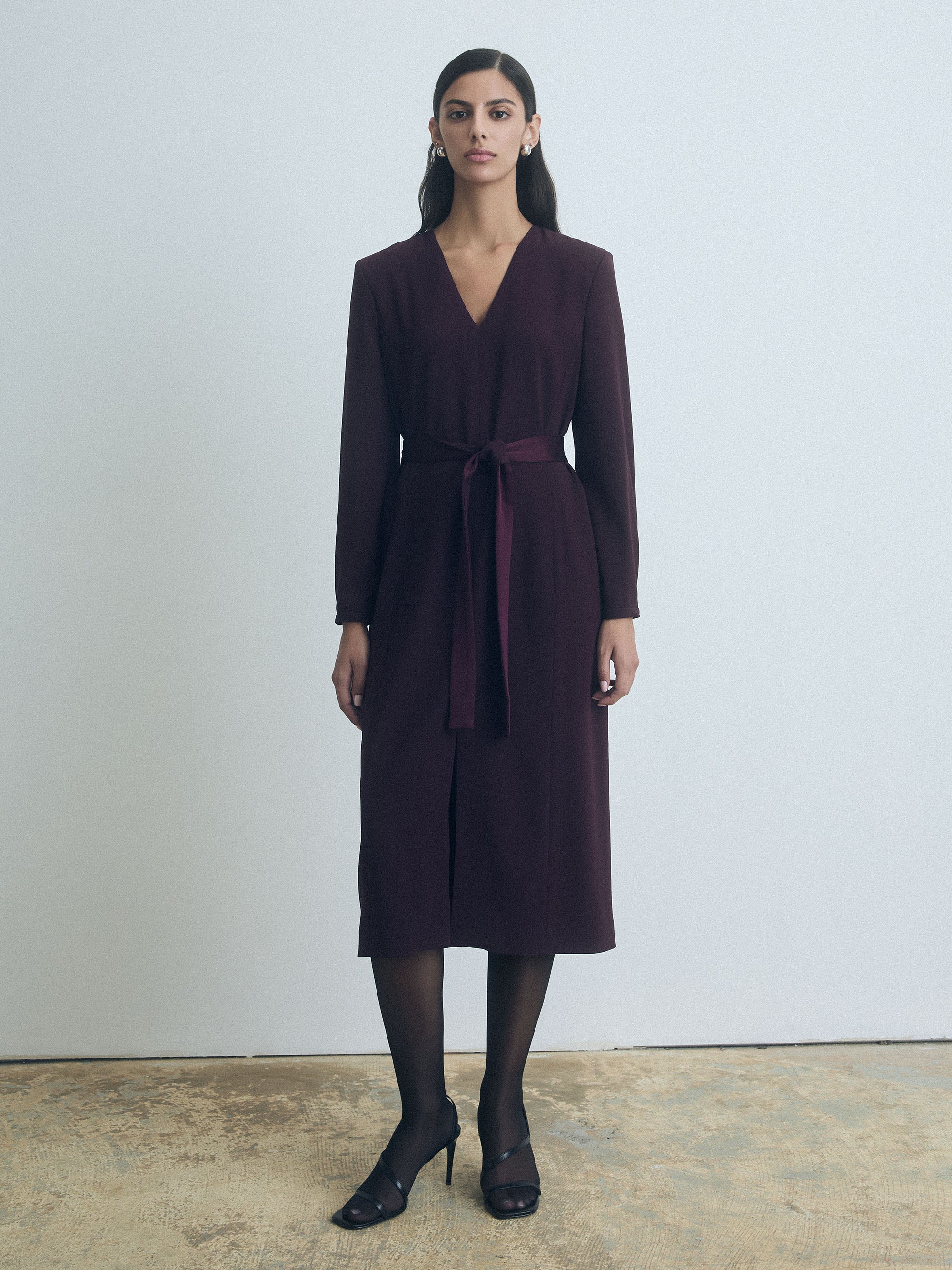 Long sleeve V-neck dress with a self belt, front vent, and invisible back zip. Fully lined.