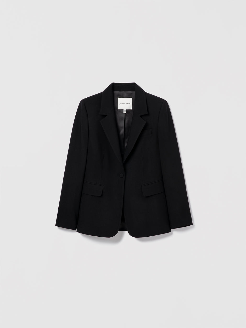 • Black fitted pencil skirt by Judith & Charles in stretch suiting fabric, featuring a clean waist, invisible back zipper, back slit, and full lining.