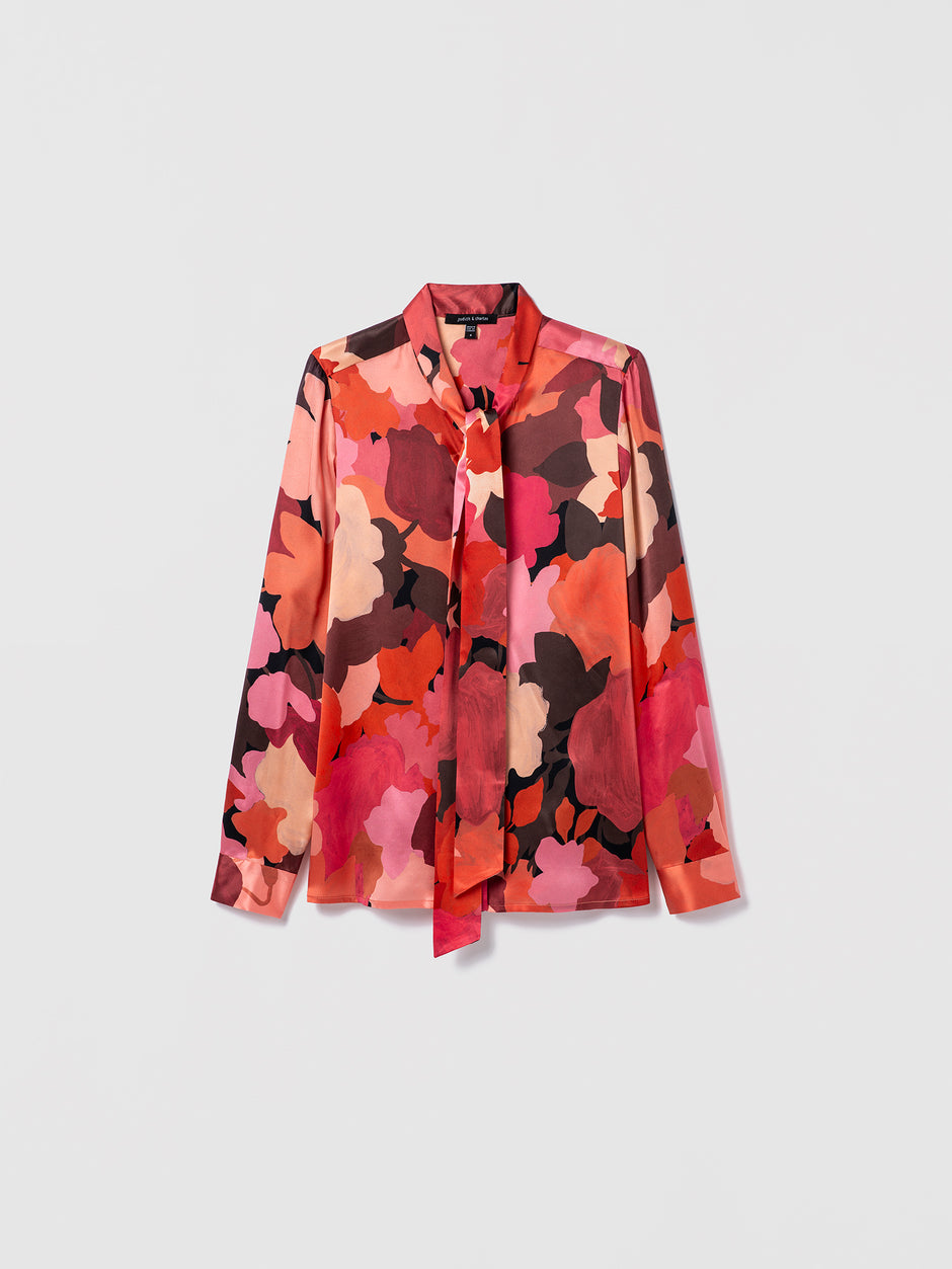 A long-sleeve blouse in Liberty floral print satin with a refined neck tie. Finished with a hidden placket for a clean, elegant line.