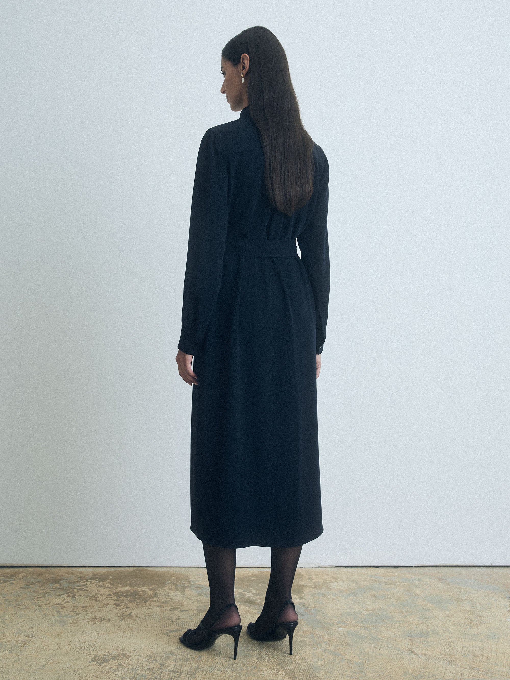 Long sleeve shirt dress with chest flap pockets, gold button front closure, self-tie belt, and buttoned cuffs.