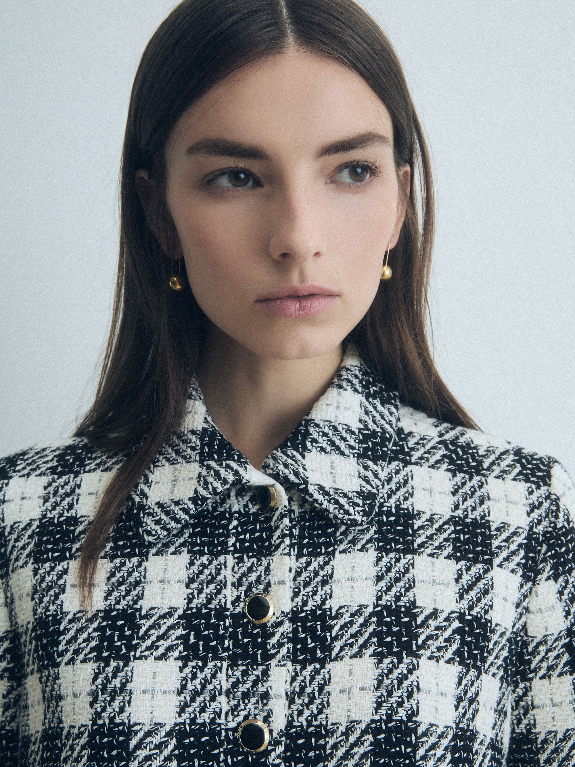 • Black and white checkered dress on a light gray background