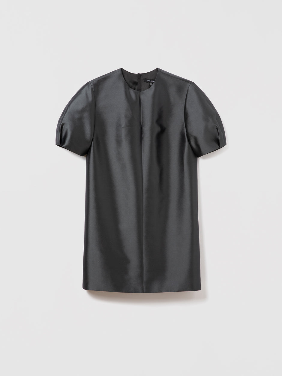 Crew neck dress with structured short sleeves and invisible back zipper. Made in Canada from silk-wool blend with full viscose lining