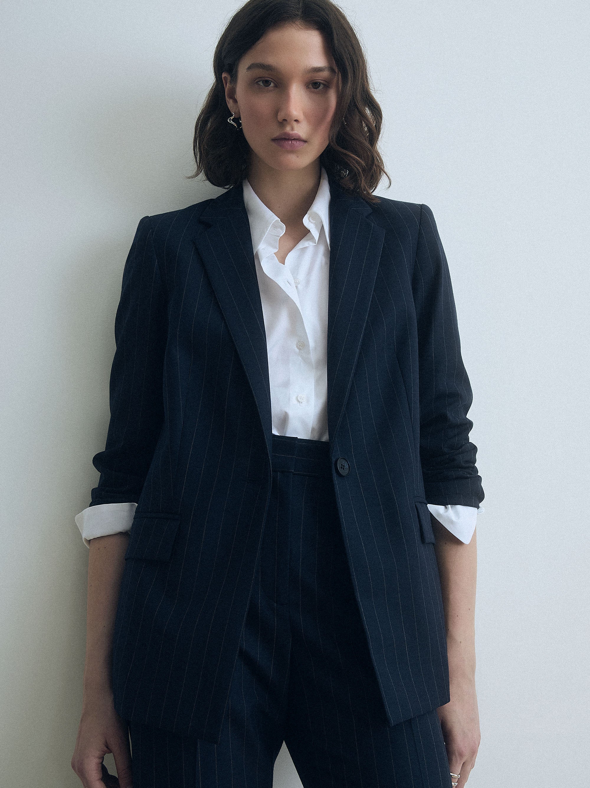 Single-breasted blazer with notch lapel and button closure. Virgin wool blend, fully lined. Made in Canada.