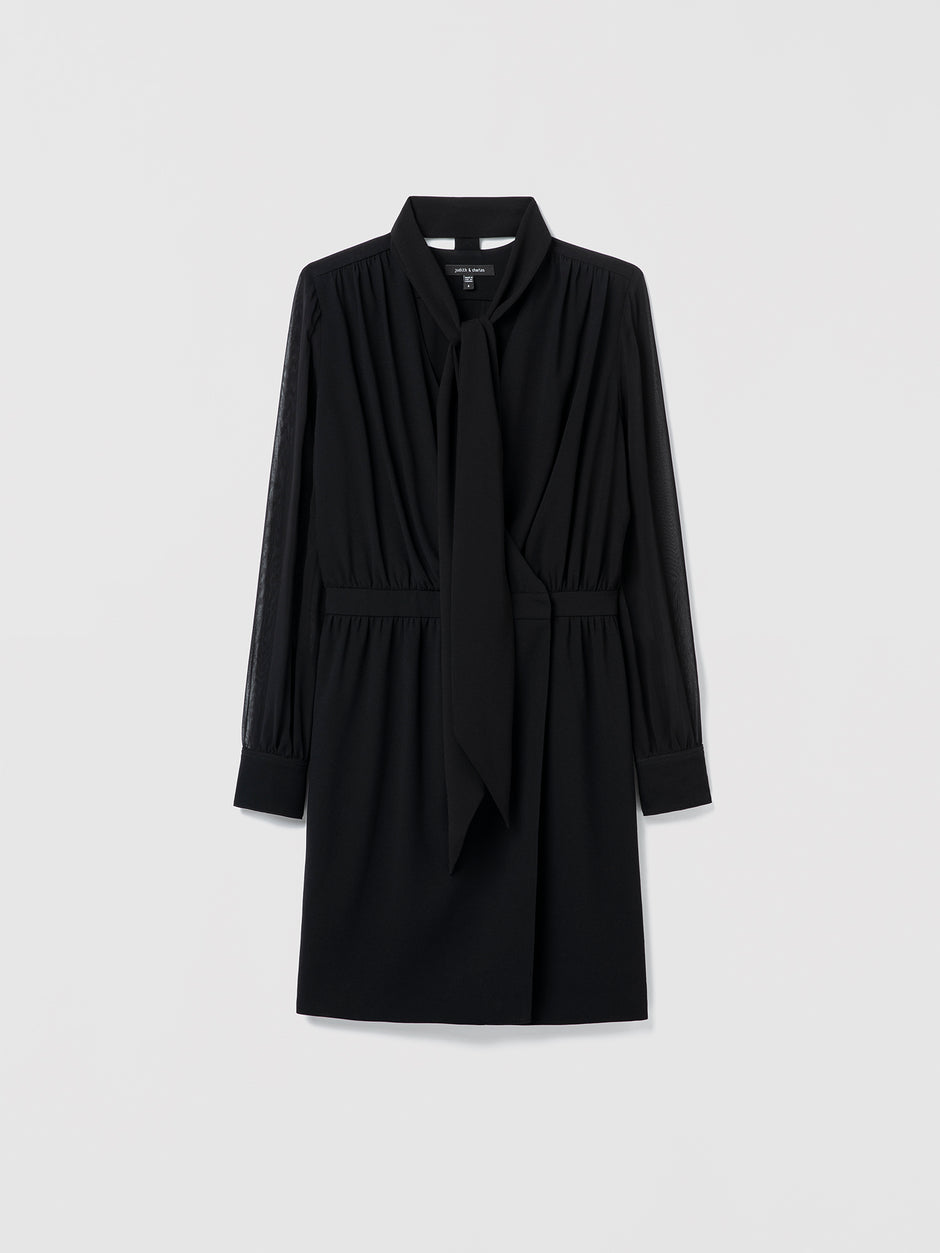 • Long-sleeve black wrap dress with V-neckline, gathered front and waist, silk-chiffon sleeves with cuffs, and removable neck tie