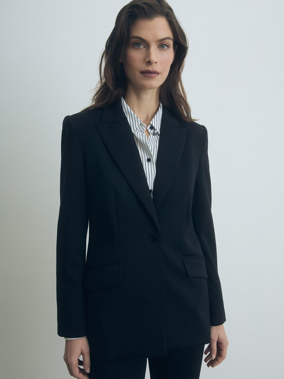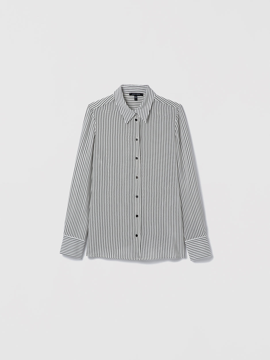 • Model wearing a fitted long-sleeve blouse in black-and-white vertical stripes with a spread collar and front button closure, paired with high-waisted black tailored trousers and black pointed-toe heels