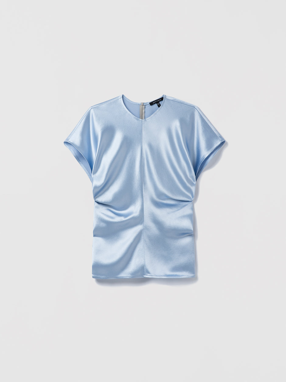 A crew-neck blouse in textured satin with cap sleeves and gathered side seams, designed for an easy fit with an invisible back closure.