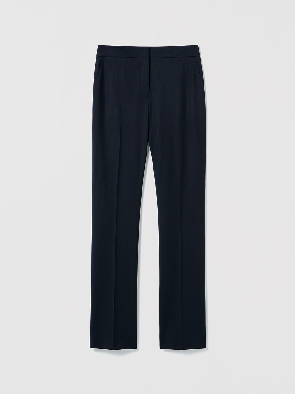Fit-to-flare wool pant with tonal pinstripes. Front zip with hook-and-eye closure, slash pockets, belt loops, and two back welt pockets.