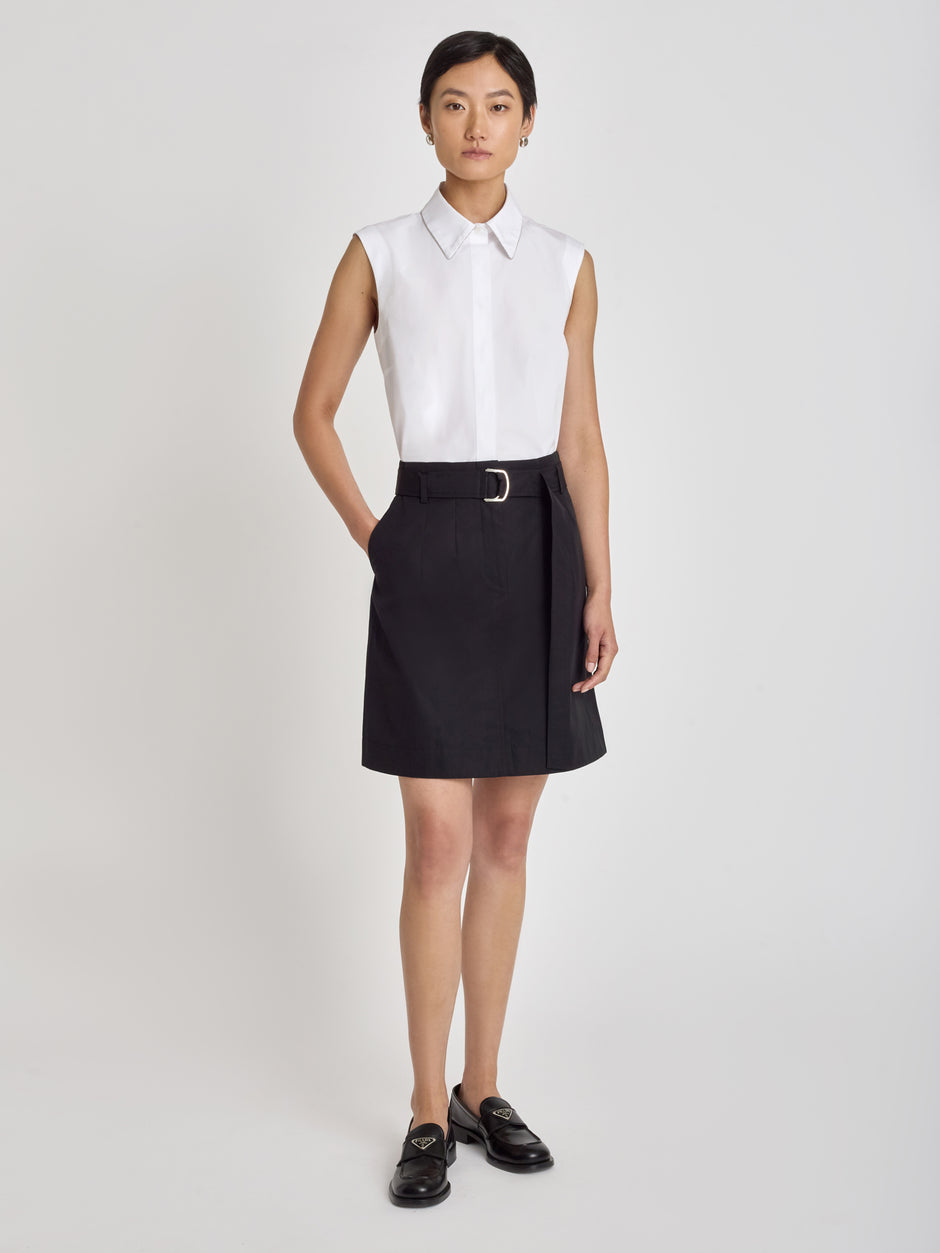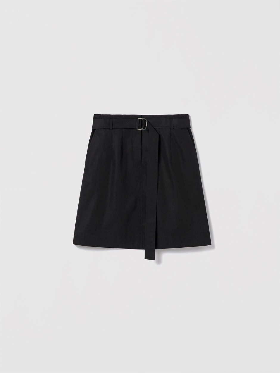 A structured trouser-inspired skirt with a front zip, slash pockets, and a self belt with a metal buckle for a clean, modern finish.